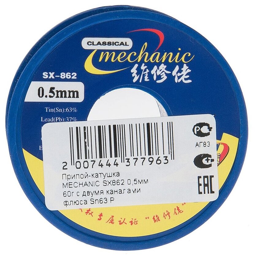Припой-катушка ПОС63 MECHANIC SX862, диаметр 1мм 60 г, с двумя каналами флюса 63% Sn, 37% Pb