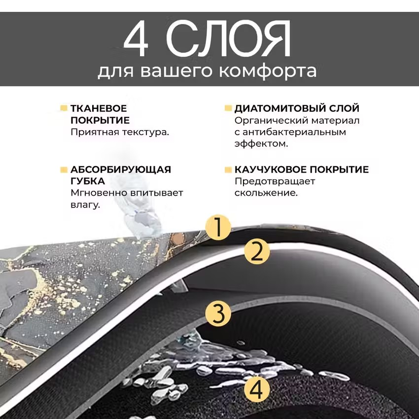 Диатомитовый коврик для ванной Conflate, антискользящий 50*80, черно-белый мрамор с золотом