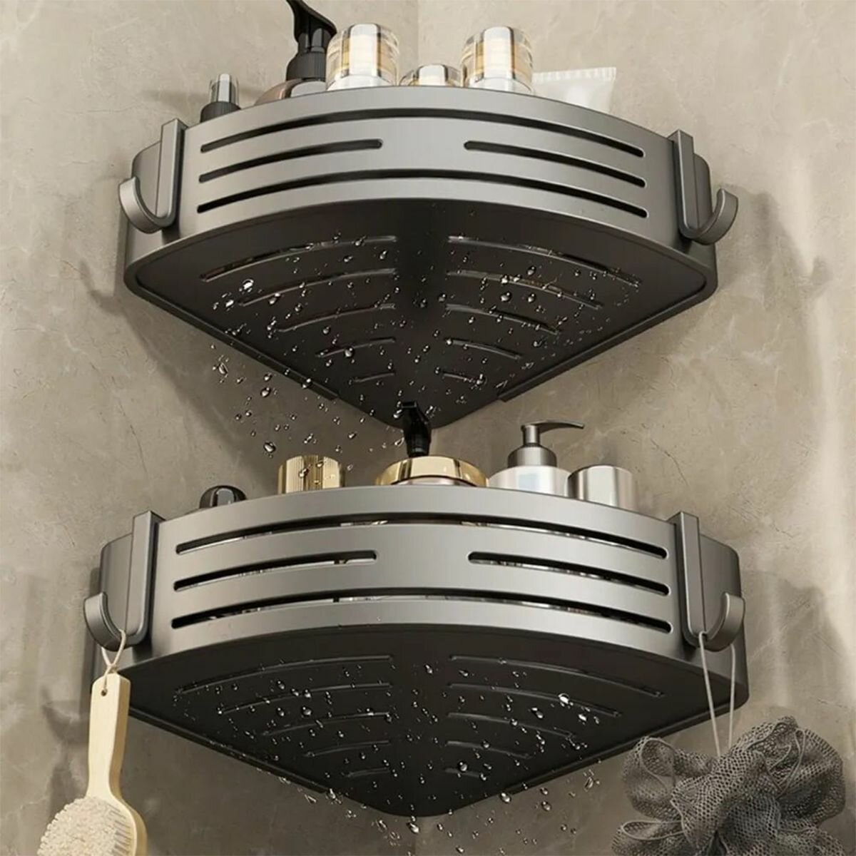 Купить Полка для ванной комнаты угловая самоклеющаяся без сверления / Подвесной органайзер с крючками для душевой кабины, туалета, кухни / Подставка настенная металлическая на липучках, серая, 2 шт