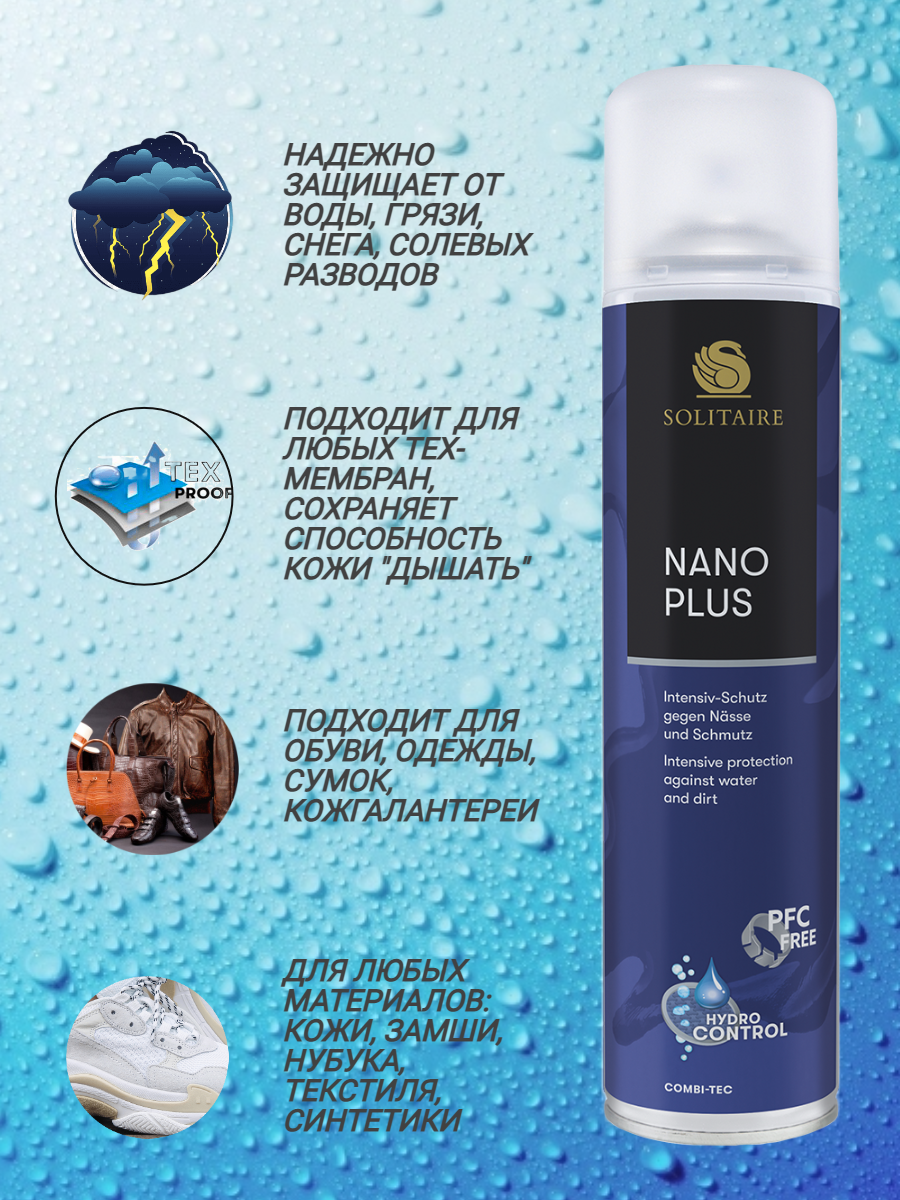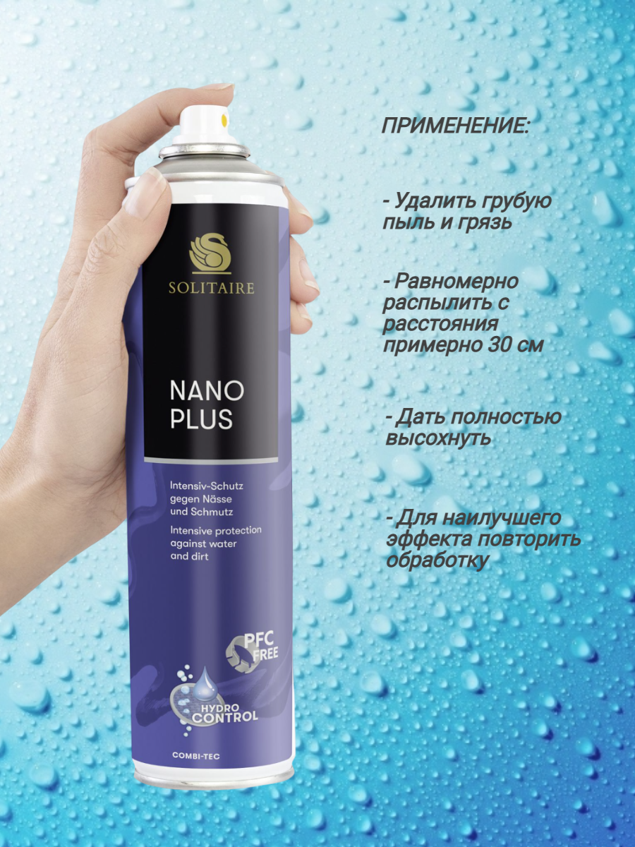 Спрей защитный Solitaire Nano Plus, для гладкой кожи, замши, нубука и текстиля, водоотталкивающий, 400мл