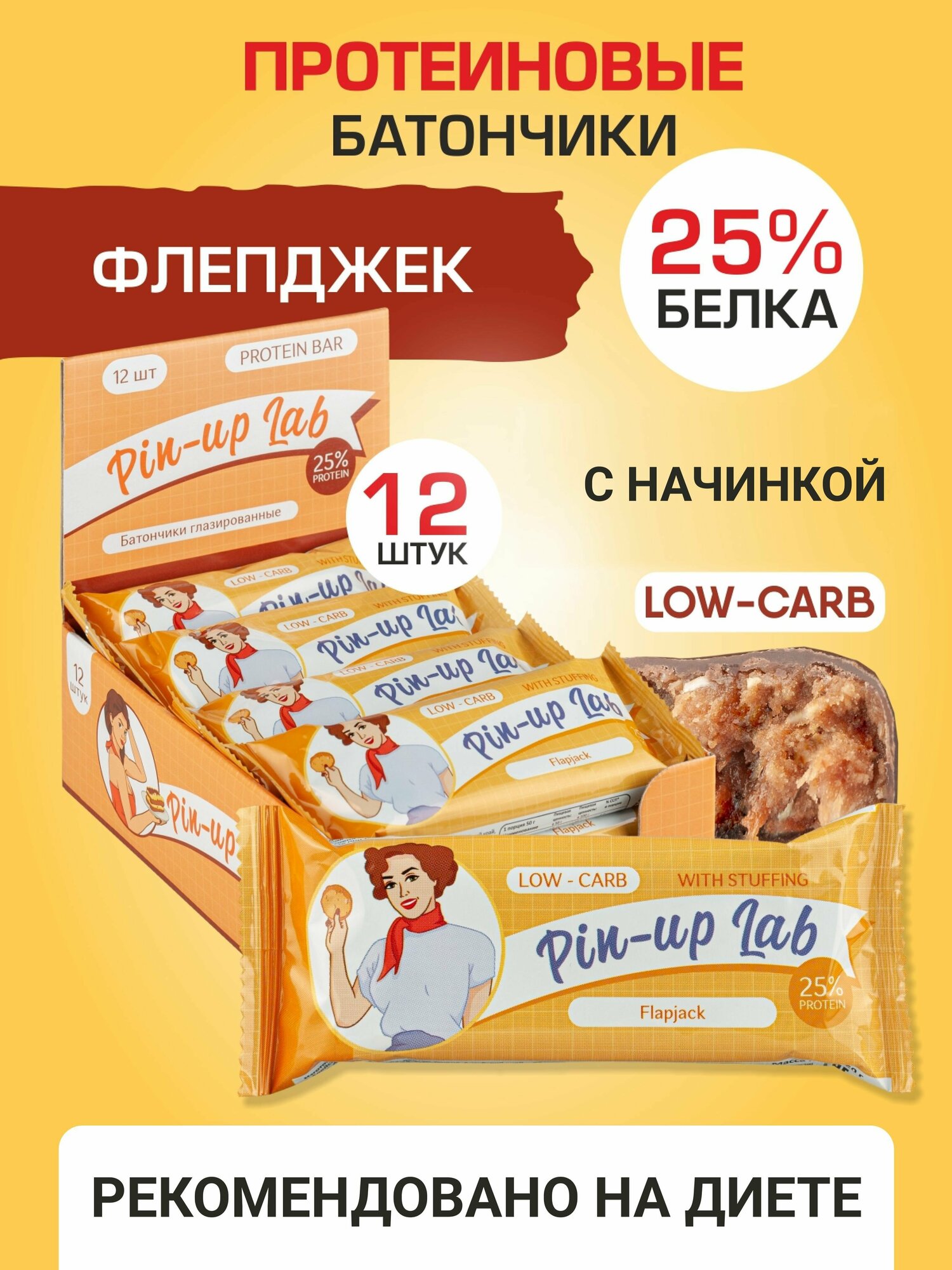 PIN UP LAB протеиновые батончики без сахара в шоколаде с начинкой Флепджек, 12 шт интересное: