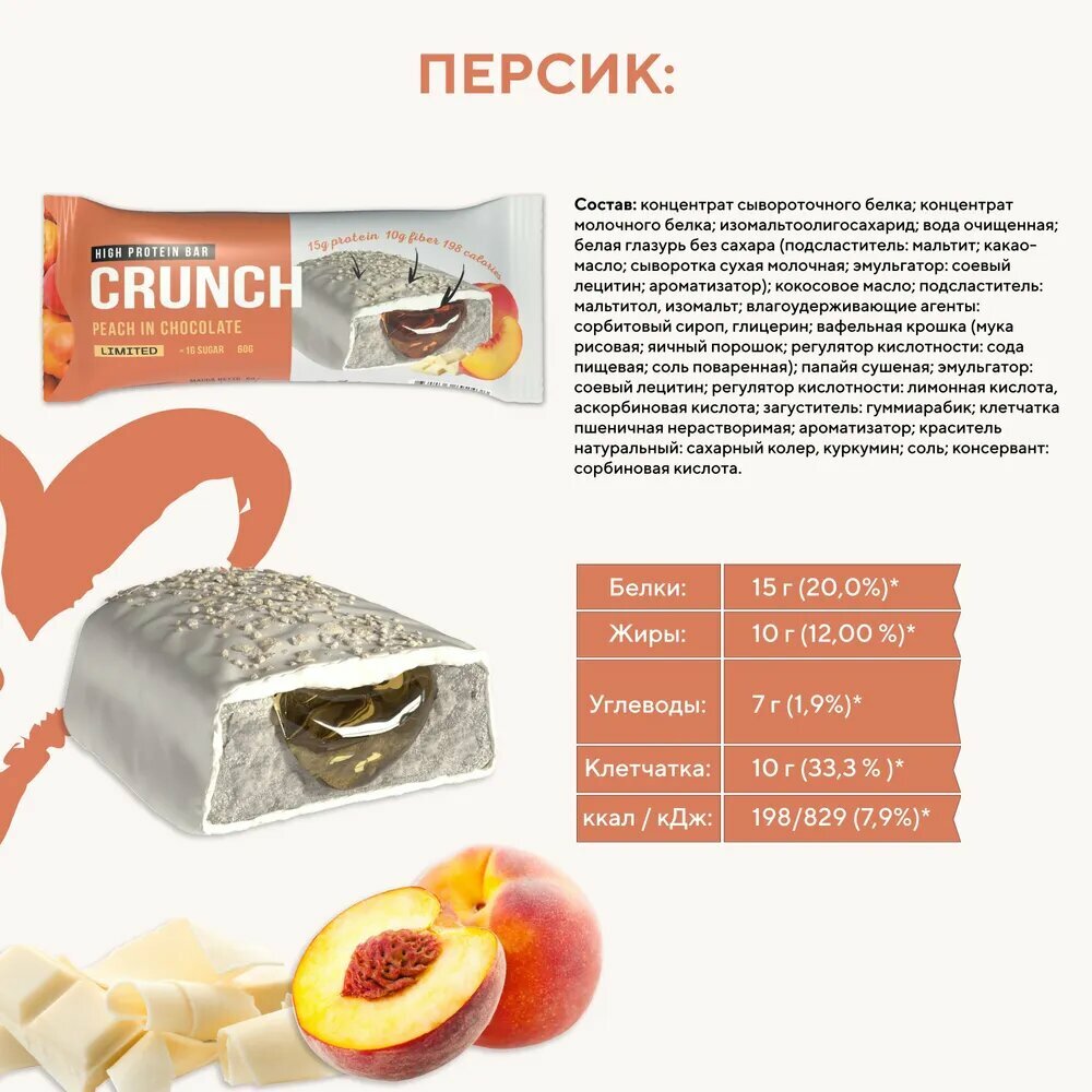 СохранитьПротеиновый батончик Crunch 16 шт 60 гр (BootyBar) Персик в шоколаде интересное: