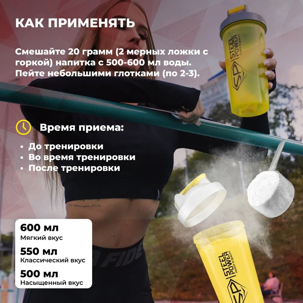 | Дополнительная информация | В качестве дополнения к основному рациону. Смешайте 20 грамм (2 мерных ложки с горкой) напитка с 500-600 мл воды. Пейте небольшими глотками (по 2-3) перед тренировкой (на разминке), во время тренировки и после нее, не дожидаясь наступления жажды. |