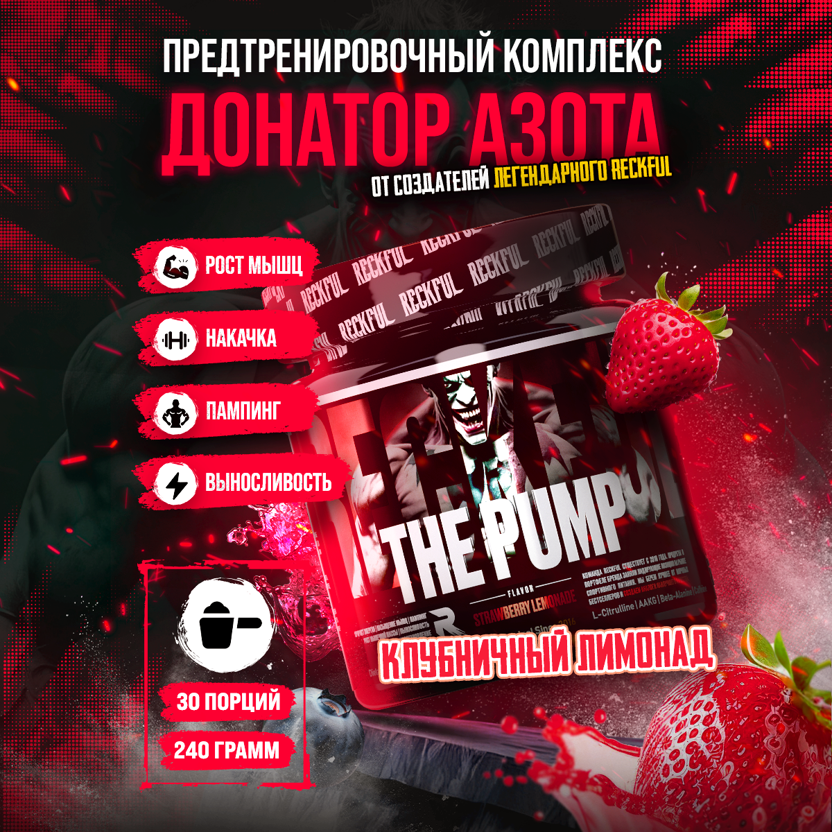 Купить Донатор Азота Предтренировочный Комплекс Reckful The Pump 30 порций Клубничный лимонад