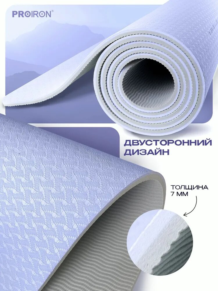 Коврик для фитнеса и йоги нескользящий PROIRON, размеры 1830*800*7мм, материал TPE, серо-фиолетовый