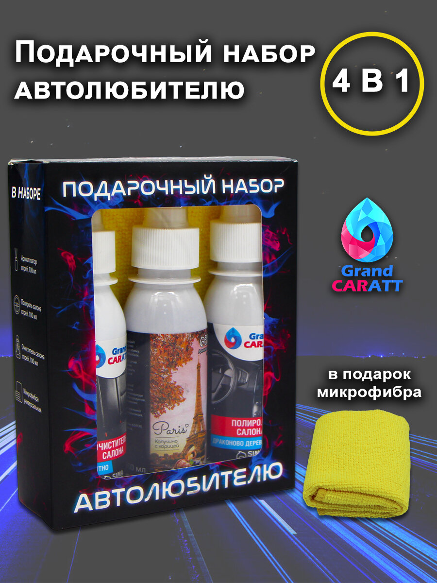 Набор автотоваров Grand Caratt "Чистый салон", ароматизатор 100 мл, полироль 100 мл, очиститель салона 100 мл, микрофибра