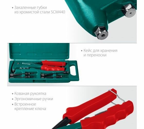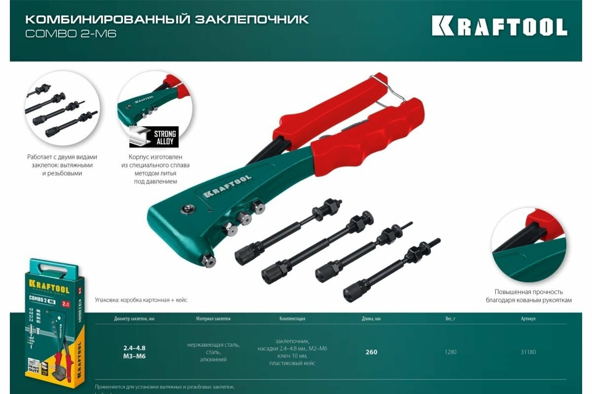 KRAFTOOL "Combo2-M6" заклепочник комбинированный в кейсе, заклепки 2.4-4.8 мм, М3-М6, литой корпус, ( 31180 ) интересное: