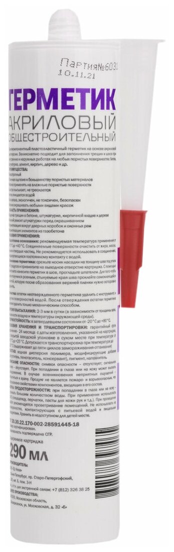 | Подробная комплектация | Герметик акриловый строительный, 290 мл |