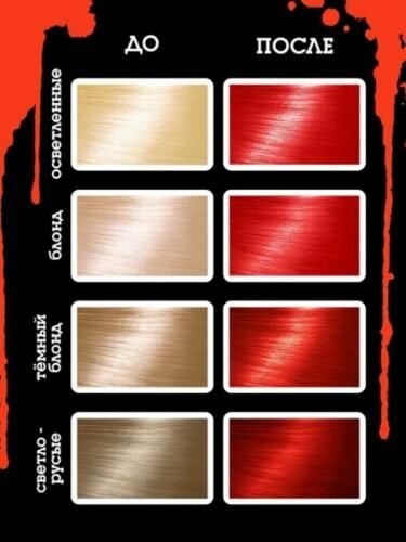 | Способ применения | СПОСОБ ПРИМЕНЕНИЯ: наденьте перчатки. Равномерно нанесите окрашивающую смесь на чистые сухие волосы. Краситель необходимо практически «втирать» в волосы. Выдержите от 20 до 30 минут, в зависимости от желаемой интенсивности цвета. По истечении времени воздействия тщательно смойте пигмент обильным количеством теплой воды, пока она не станет прозрачной. Не используйте шампунь. Краситель может оставлять следы на полотенце и подушке. Для максимальной яркости и стойкости рекомендуем предварительно обесцветить волосы. |