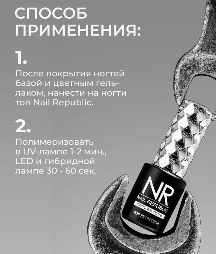 | Способ применения | после покрытия ногтей базой и цветным гель-лаком, нанести на ногти топ Nail Republic. Полимеризовать в UV-лампе 1-2 мин., LED и гибридной лампе 30 - 60 сек |