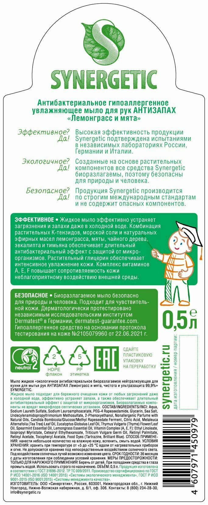 Жидкое мыло для рук Synergetic антибактериальное нейтрализующее запах "Лемонграсс и мята" 500 мл