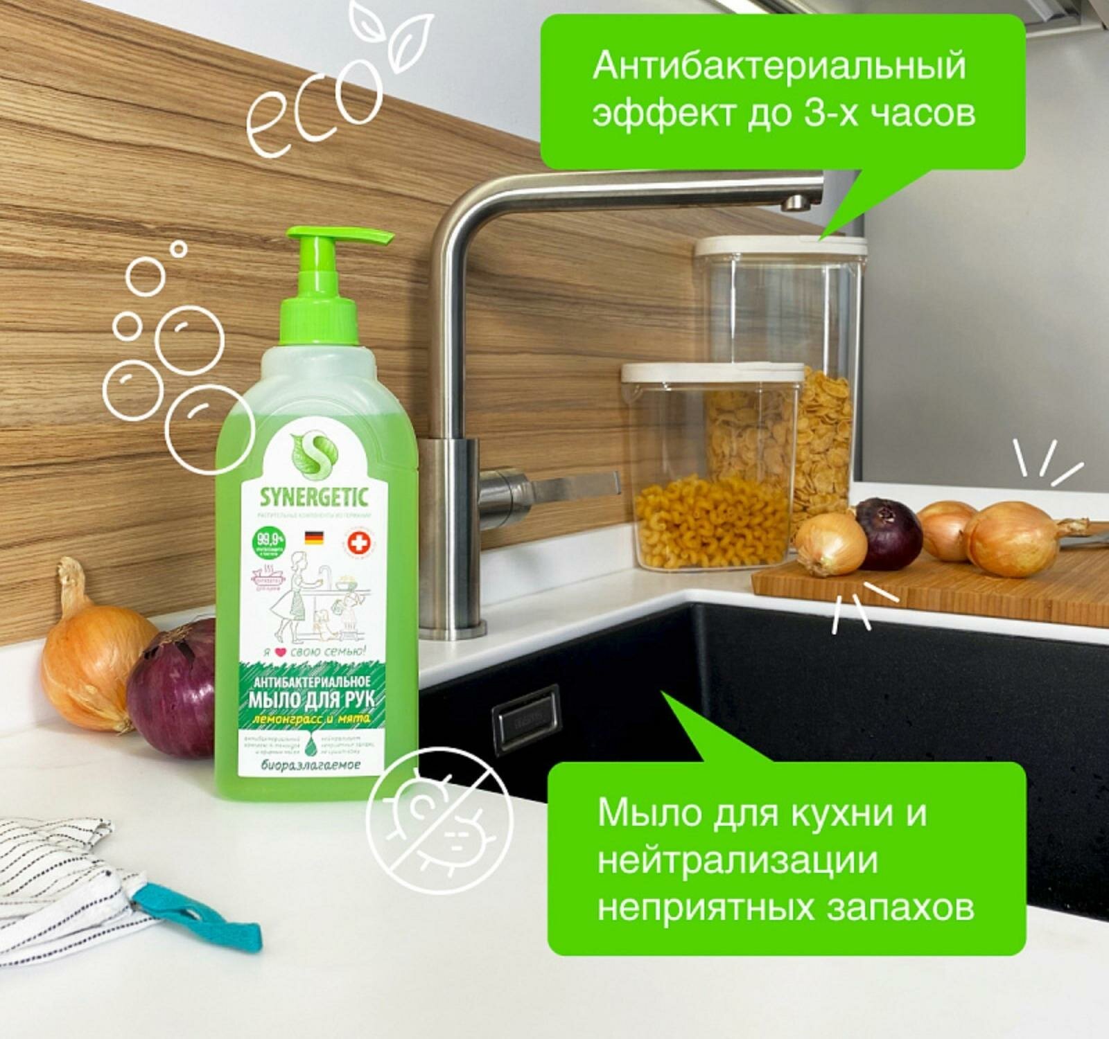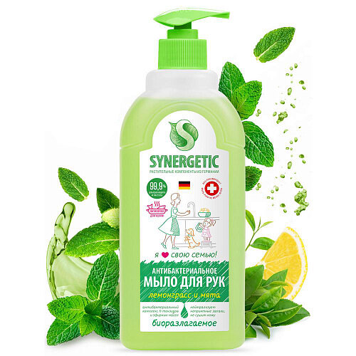 Жидкое мыло SYNERGETIC "Лемонграсс и Мята", антибактериальное, с витаминами A, E, F, 500мл
