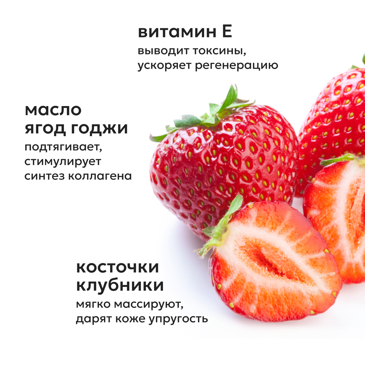 | Состав | sugar (сахар), aqua, propylene glycol, cocamidopropyl betain, cocamide dea, mineral oil, silica, polipropene, tocopheryl acetate (витамин е), parfum, olea europaea (olive) leaf extract (эктракт оливы), eriobotrya japonica leaf extract (экстракт мишмулы японской), persea gratissima (avocado) oil (масло авокадо), lycium barbarum (goji) seed oil (масло ягод годжи), strawberry seed powder (измельченная косточка клубники) |