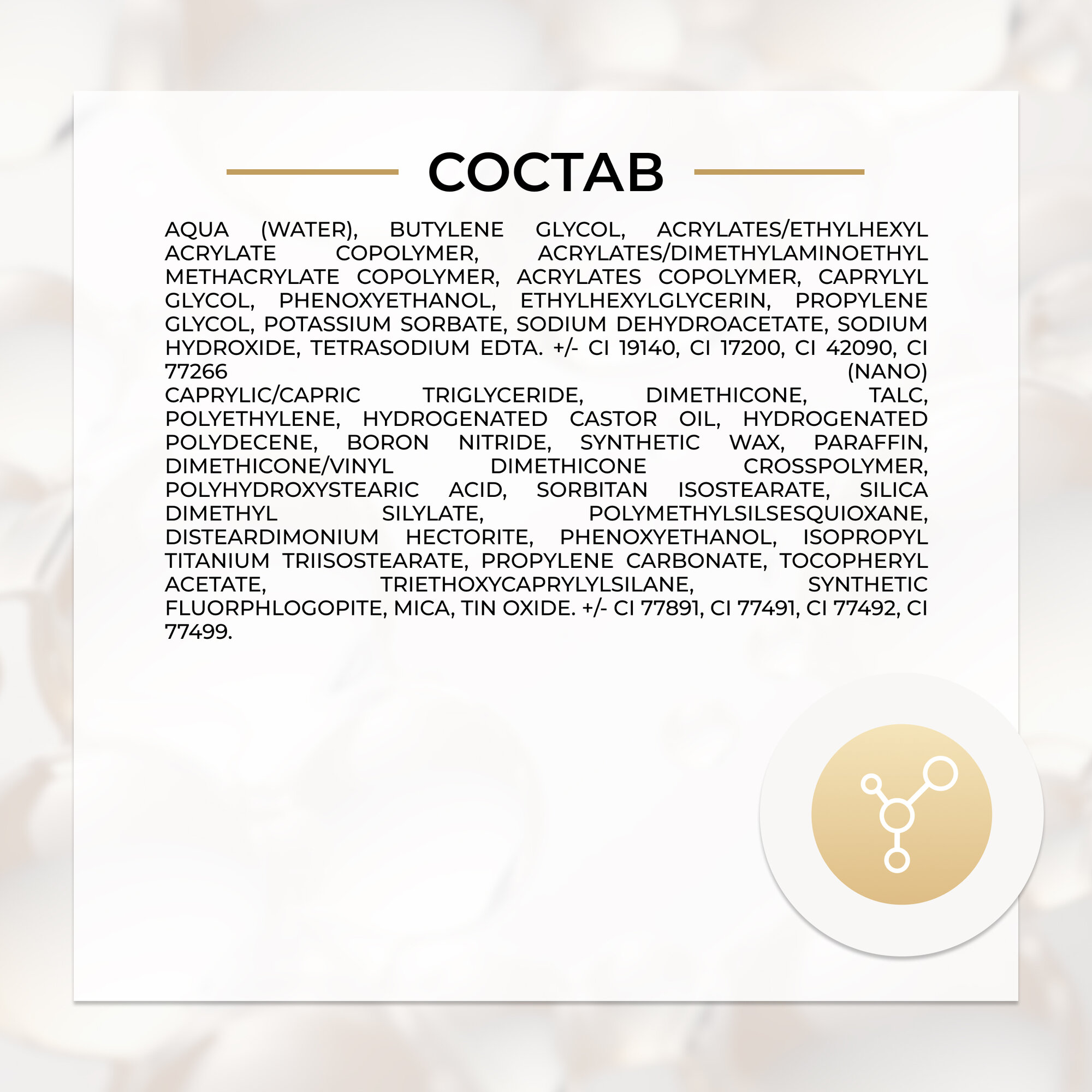 | Состав | Маркер: Aqua (Water), Butylene Glycol, Acrylates/Ethylhexyl Acrylate Copolymer, Acrylates/Dimethylaminoethyl Methacrylate Copolymer, Acrylates Copolymer, Caprylyl Glycol, Phenoxyethanol, Ethylhexylglycerin, Propylene Glycol, Potassium Sorbate, Sodium Dehydroacetate, Sodium Hydroxide, Tetrasodium EDTA. +/- CI 19140, CI 17200, CI 42090, CI 77266 (nano). Пудра: Caprylic/Capric Triglyceride, Dimethicone, Talc, Polyethylene, Hydrogenated Castor Oil, Hydrogenated Polydecene, Boron Nitride, Synthetic Wax, Paraffin, Dimethicone/Vinyl Dimethicone Crosspolymer, Polyhydroxystearic Acid, Sorbitan Isostearate, Silica Dimethyl Silylate, Polymethylsilsesquioxane, Disteardimonium Hectorite, Phenoxyethanol, Isopropyl Titanium Triisostearate, Propylene Carbonate, Tocopheryl Acetate, Triethoxycaprylylsilane, Synthetic Fluorphlogopite, Mica, Tin Oxide. +/- CI 77891, CI 77491, CI 77492, CI 77499. |