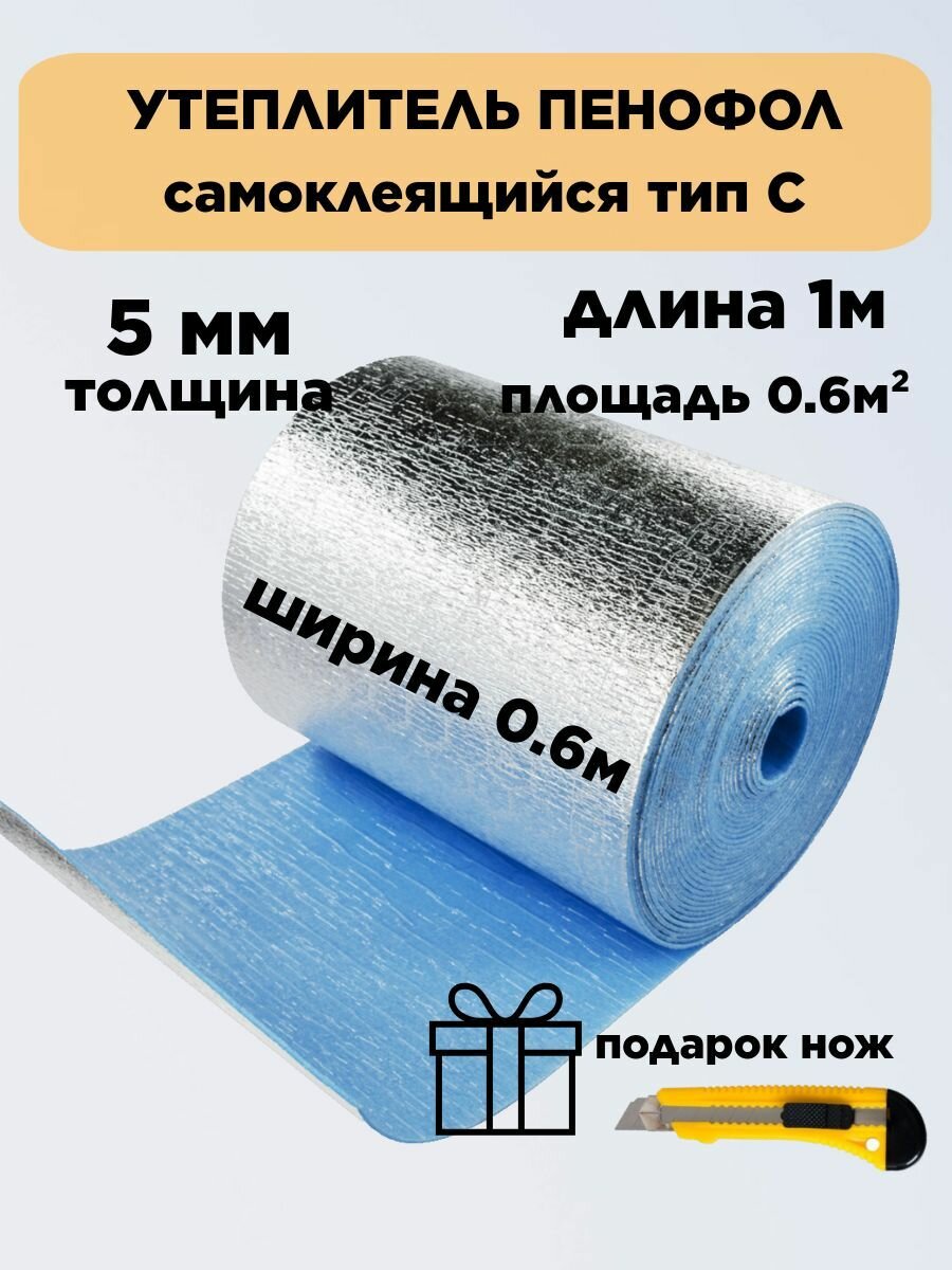 Фольгированный утеплитель пенофол 2000 С5 5 мм самоклеящийся ГОСТ 10 метров (6м2)