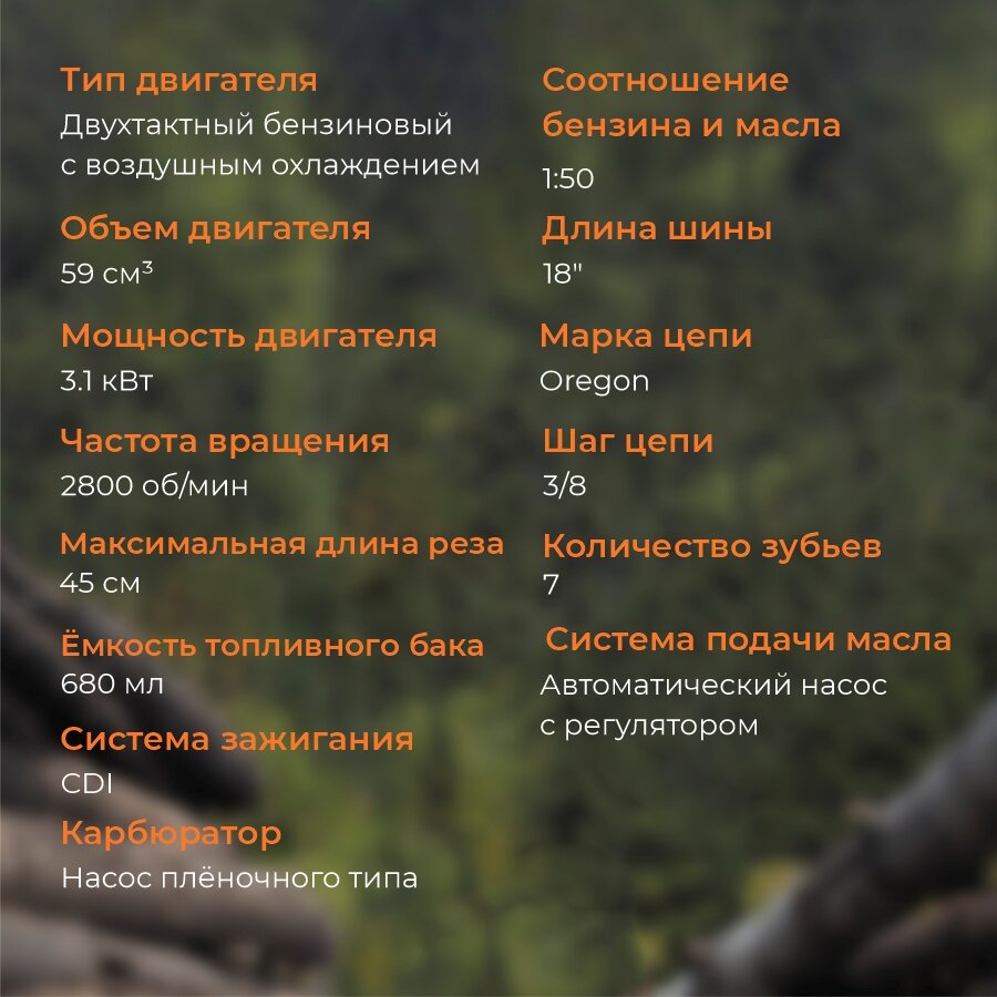 | Комплект поставки | Бензопила; Шина направляющая; Пильная цепь; Канистра для наведения смеси; Сумка для ключей; Отвертка; Свечной ключ; Ключ Torx; Зубчатый упор; Чехол для шины; Инструкция |
