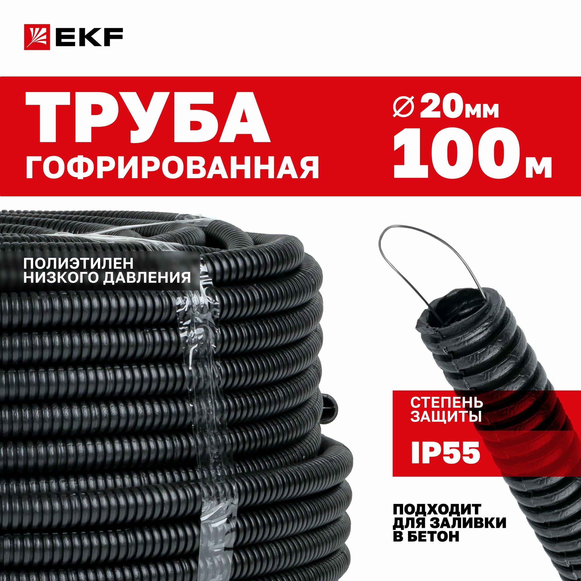 Труба гофрированная ПНД тяжелая с протяжкой d20 мм (100 метров), черная, EKF-Plast
