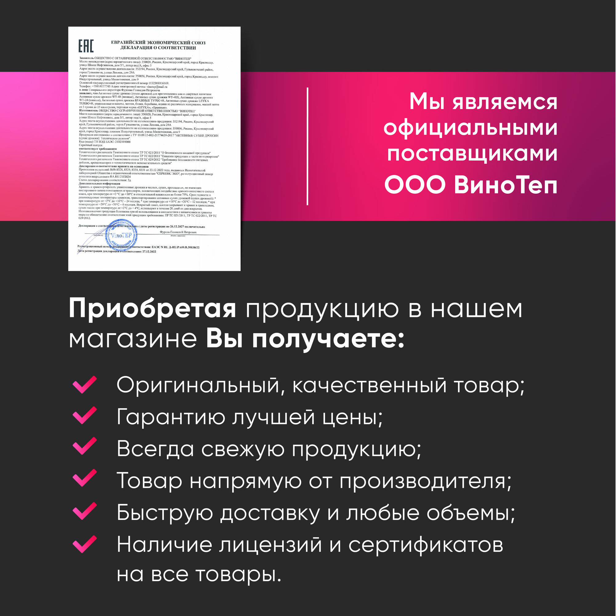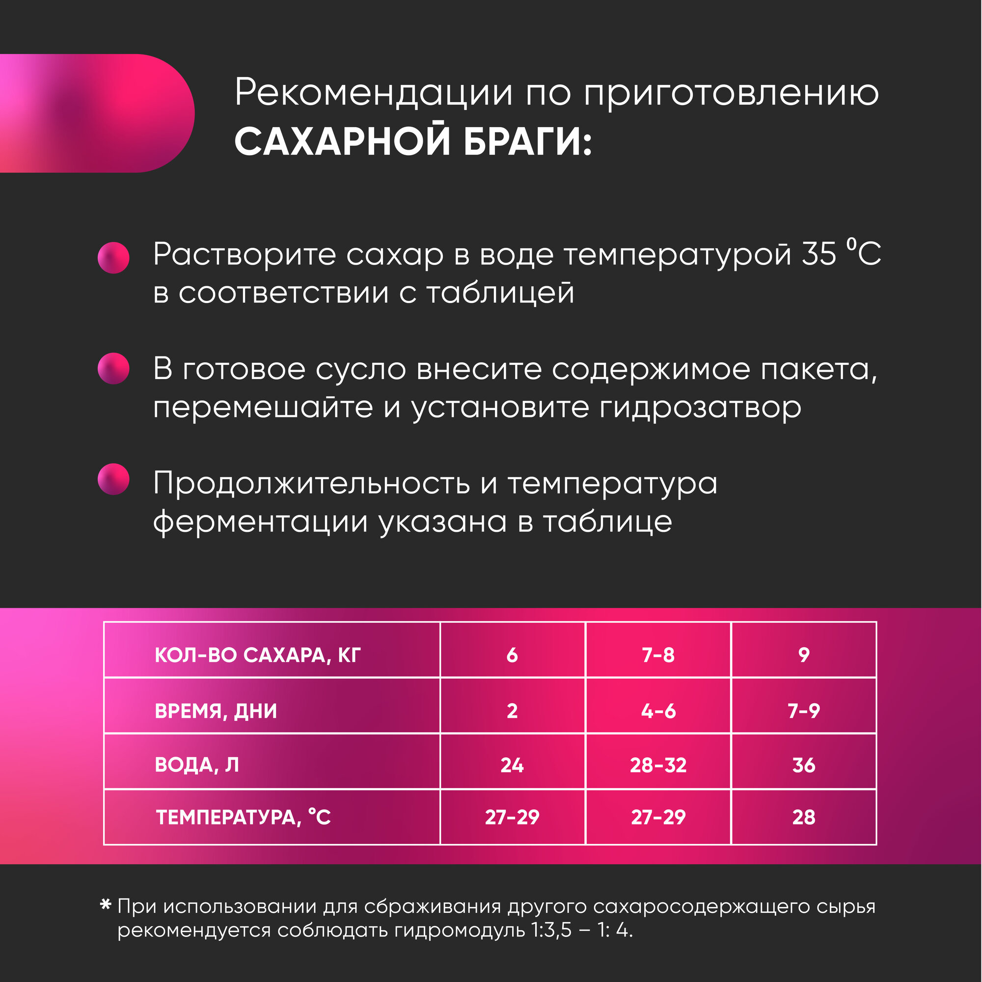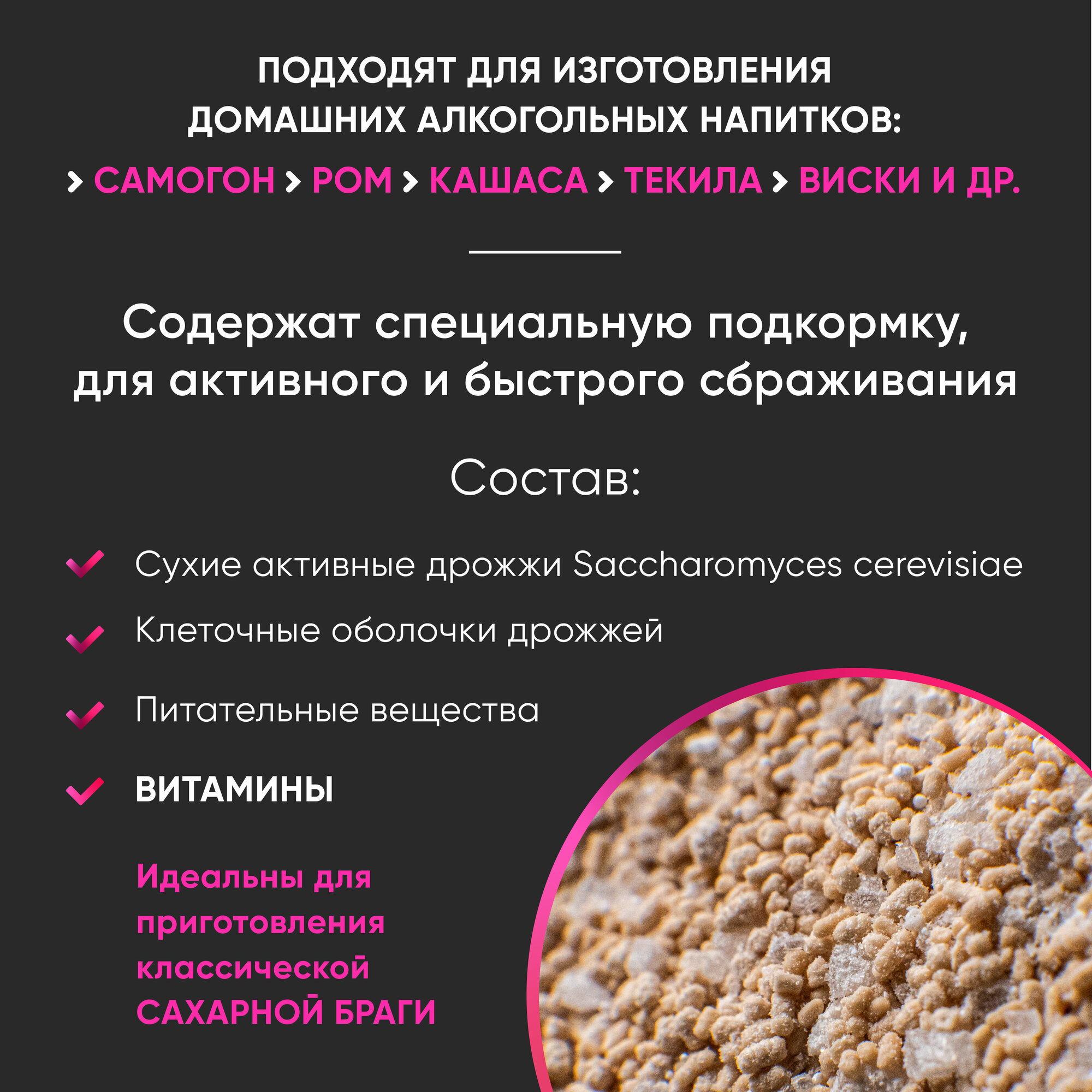 | Состав | сухие активные дрожжи Saccharomyces cerevisiae, питательные вещества, клеточные оболочки дрожжей, витамины |