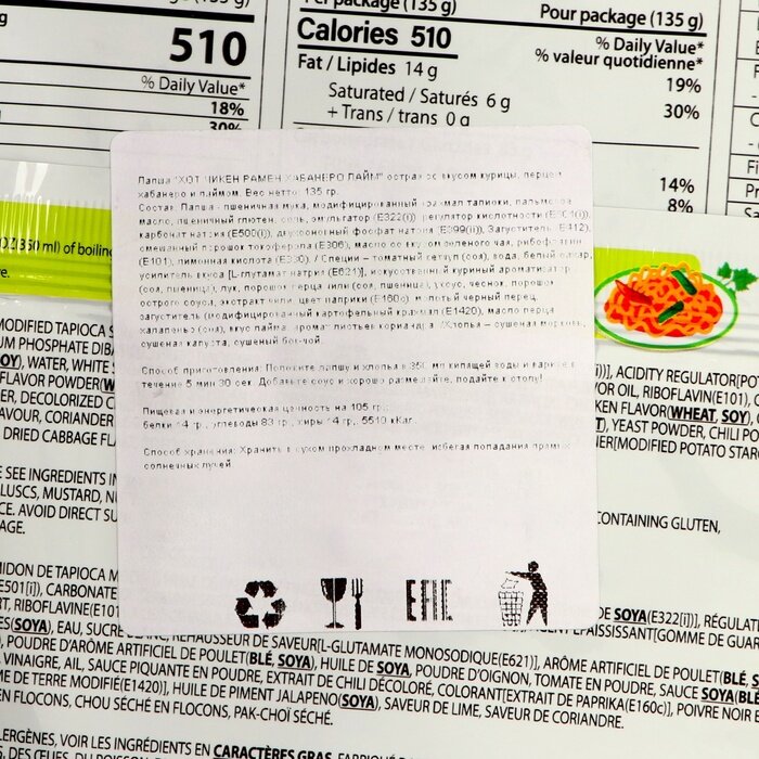 | Состав | пшеница, модифицированный тапиоковый крахмал, рафинированное пальмовое масло, пшеничный глютен, эмульгатор соли (соевый лецитин E322i, регулятор кислотности, карбонат калия E501i, карбонат натрия E500i, фосфат натрия Двухосновный E339i, загуститель [гуаровая камедь (E412)], токоферолы E306, масло со вкусом зеленого чая, рибофлавин E101, лимонная кислота E330, томатный кетчуп (соя, вода, белый сахар, усилитель вкуса [L-глутамат натрия (E621)] , искусственный ароматизатор курицы пшеница, соя), лук, порошок перца чили (содержит сою), порошок искусственного ароматизатора курицы (пшеница, СОЯ), соевое масло, луковый порошок, томатный порошок, соевый соус (содержит пшеницу), дрожжевой порошок, уксус, чеснок, порошок острого соуса, обесцвеченный экстракт чили, краситель экстракт паприки E160c, порошок черного перца, загуститель E1420, масло перца халапеньо (содержит сою), ароматизатор лайма, ароматизатор листьев кориандра. |