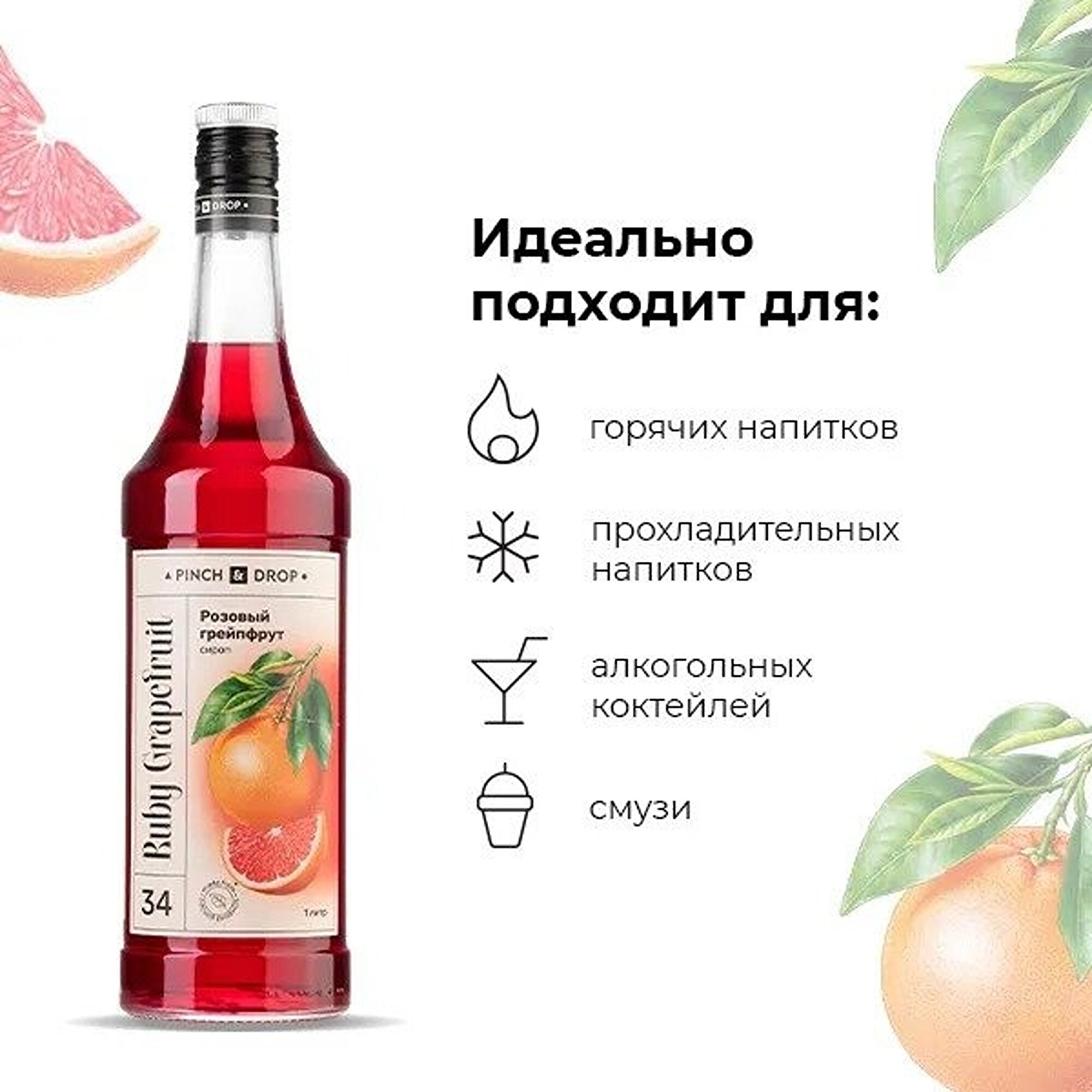 Сироп "Розовый Грейпфрут" от бренда "PINCH&DROP", стеклянная бутылка, 1 литр