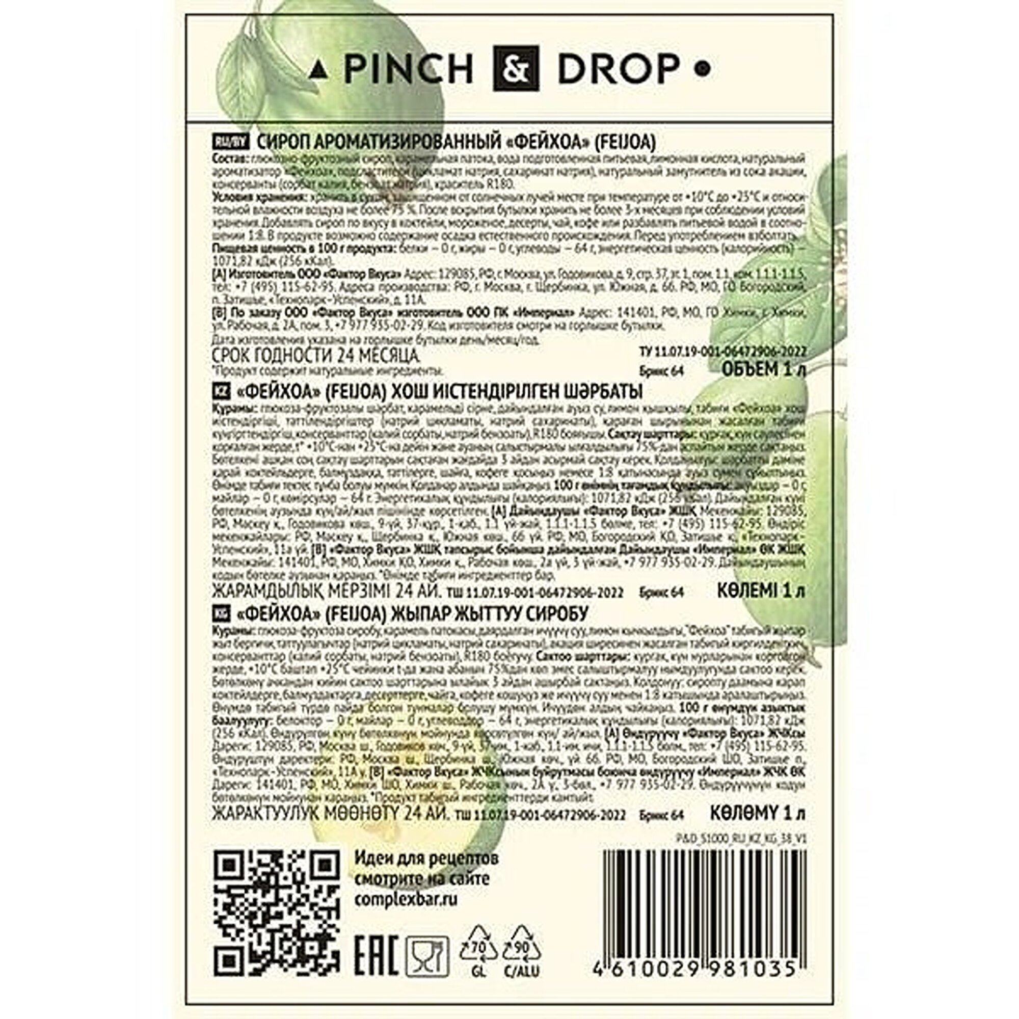 Сироп "Фейхоа" от бренда "PINCH&DROP", стеклянная бутылка, 1 литр