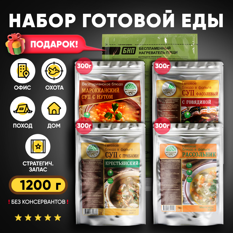 СохранитьКронидов Набор из 4 готовых блюд в реторт-пакете Рассольник/Суп с грибами Крестьянский/Суп фасолевый с говядиной/Суп Марокканский + Подарок БНП 1 шт. интересное: