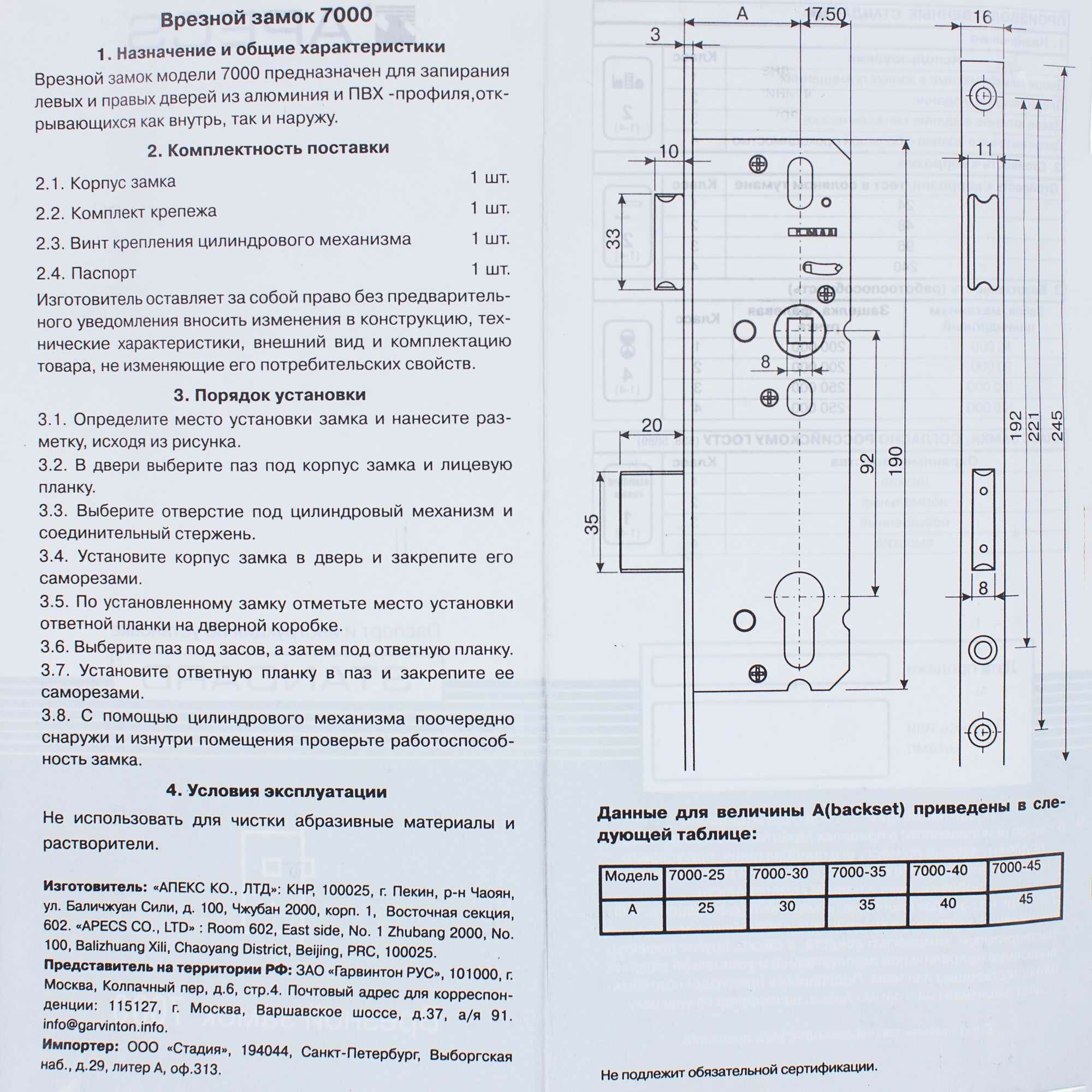 | Максимальная толщина двери | 150 мм |
