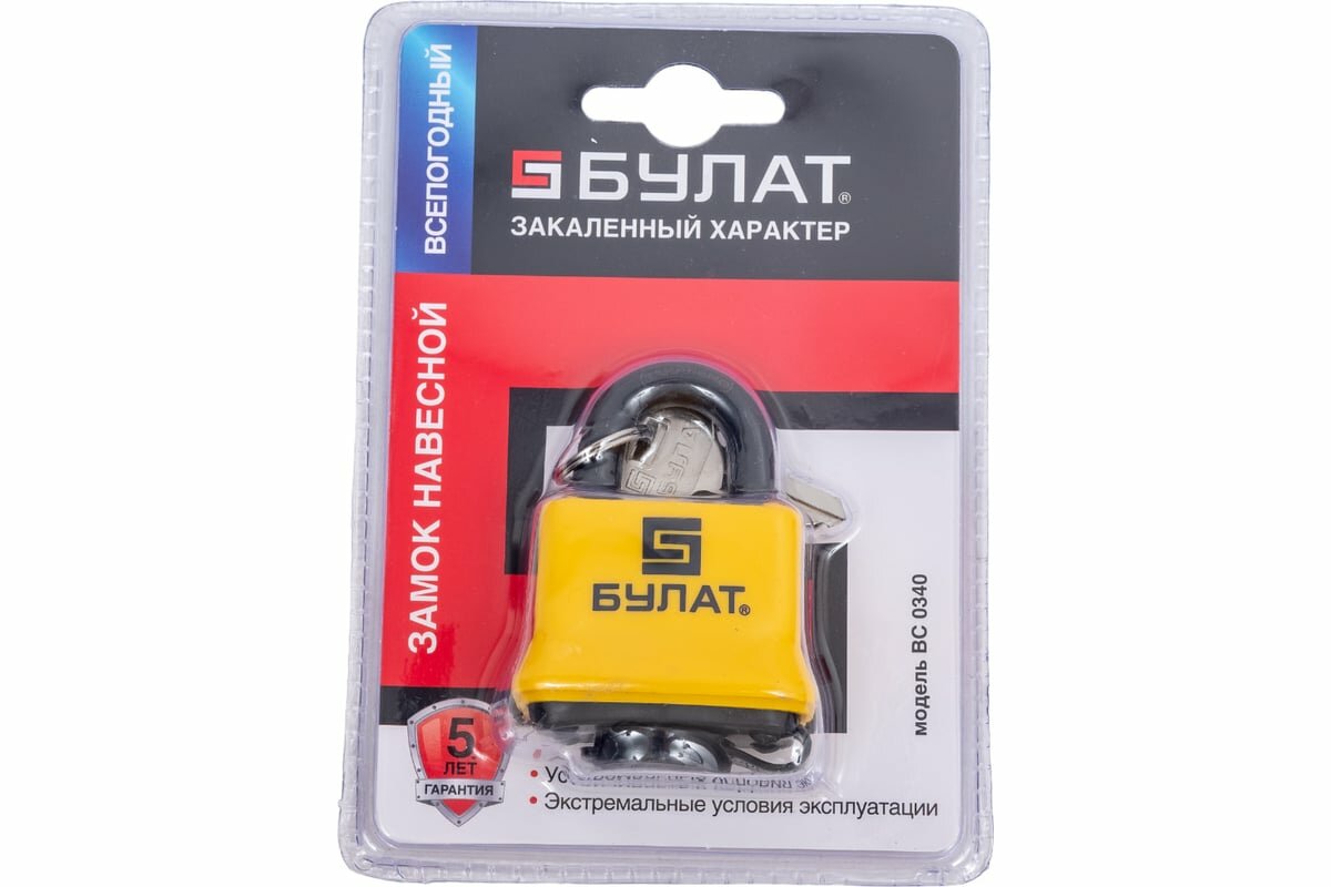 Купить Замок навесной Булат, ВС 0340, 13 454, блистер, цилиндровый, всепогодный, желтый, 51 мм, 5 ключей