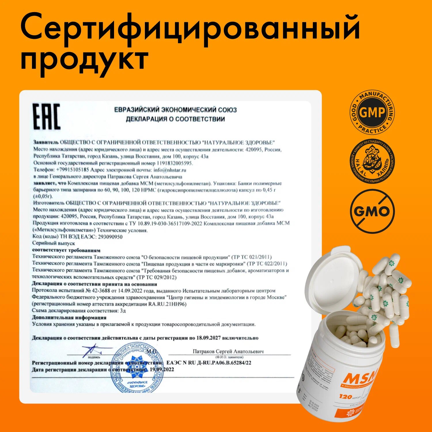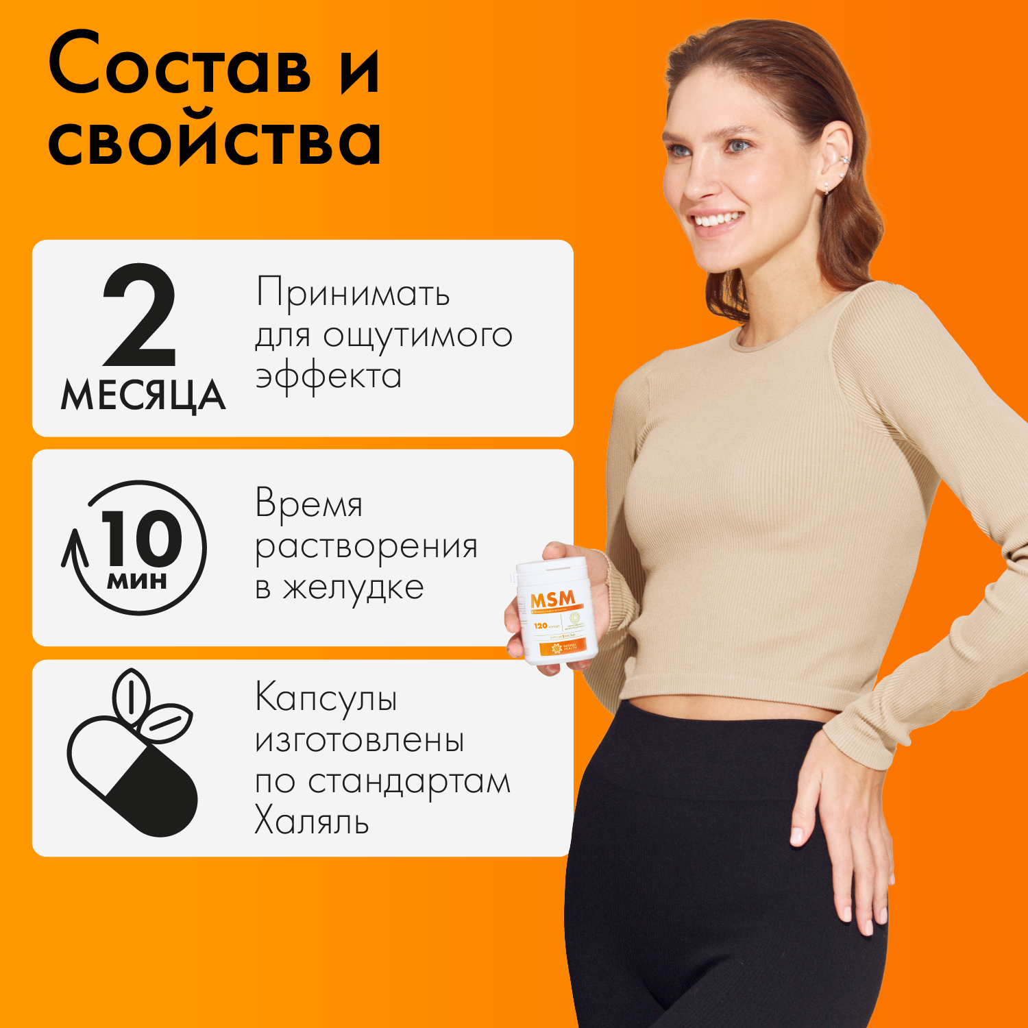 | Дополнительная информация | Состав: метилсульфонилметан, желатиновая капсула (халяль). |
