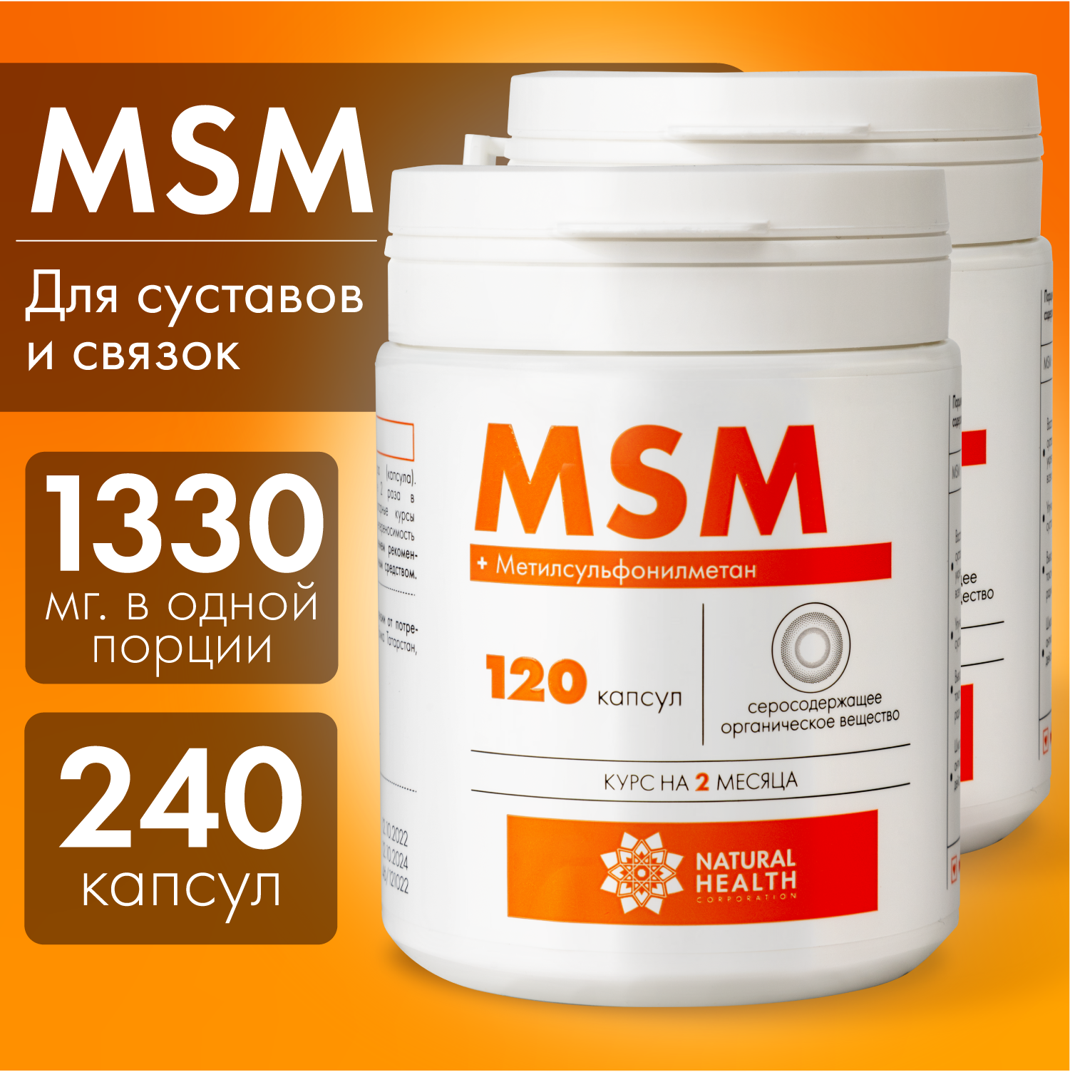 MSM витамин для суставов, хрящей, связок Natural Health метилсульфонилметан, серосодержащее вещество, 120 капсул