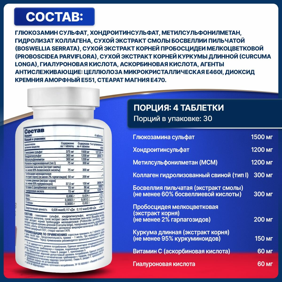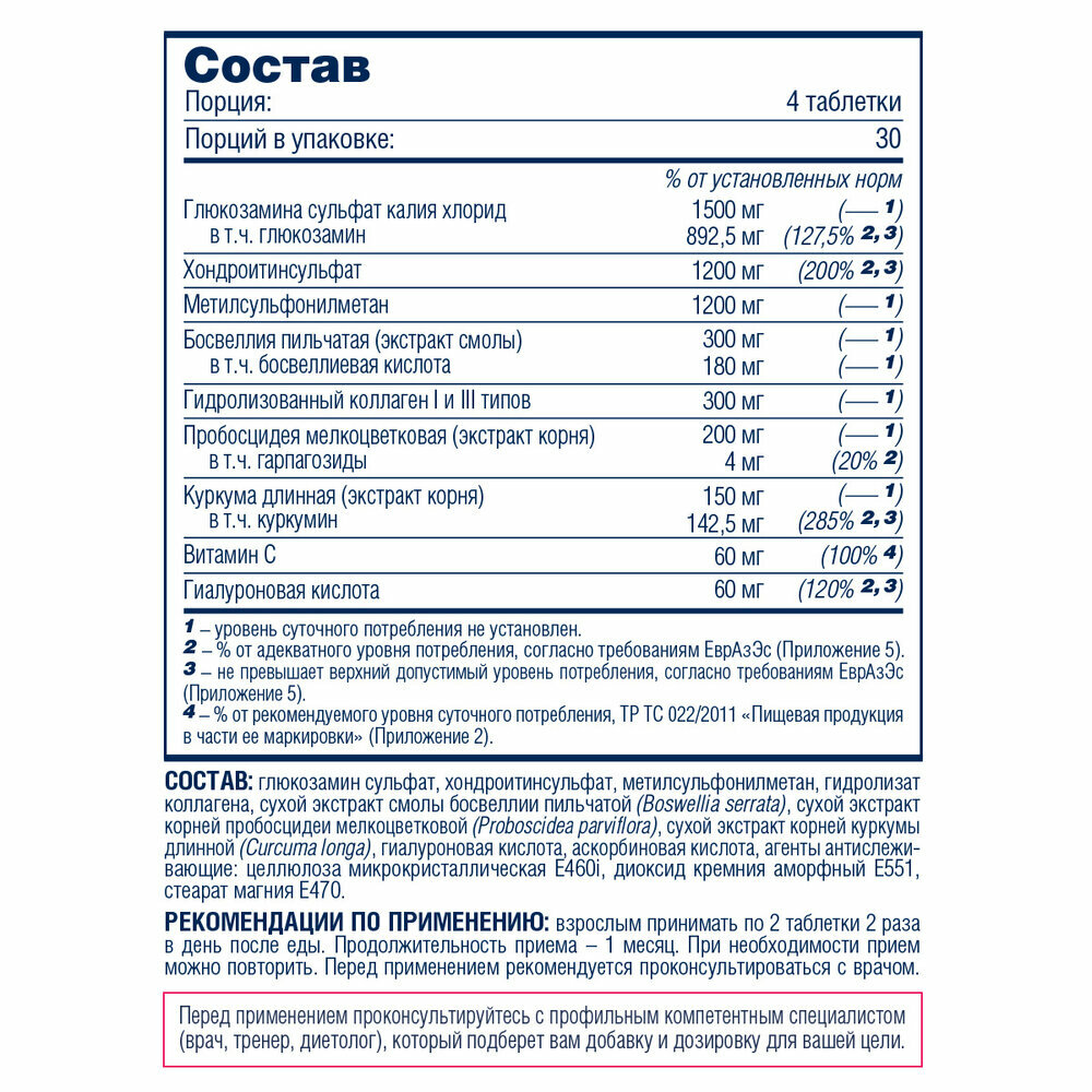 | Основной ингредиент | MCM / глюкозамин / коллаген / куркумин / хондроитин |