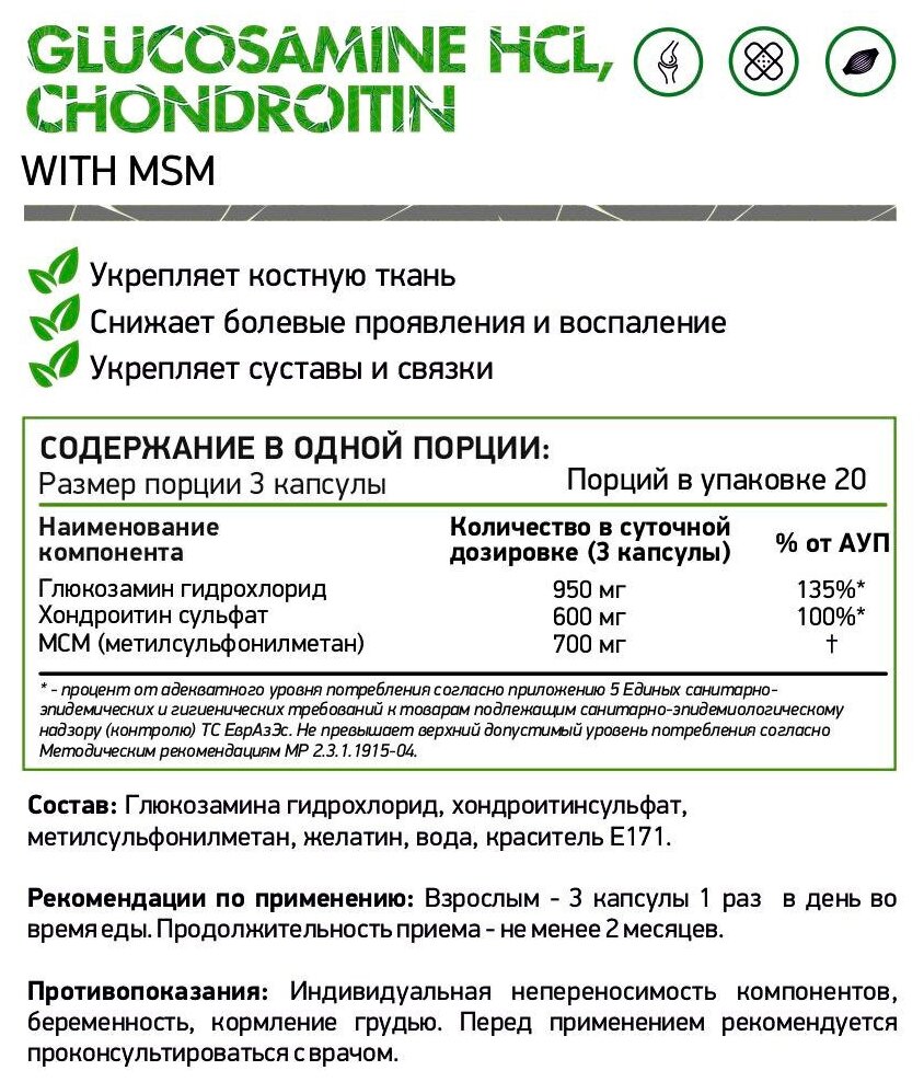 | Дополнительная информация | рекомендации по применению: взрослым - 3 капсулы 1 раз в день во время еды; продолжительность приема - не менее 2 месяцев; состав: глюкозамина гидрохлорид, хондроитинсульфат, метилсульфонилметан, оболочка капсулы (желатин, вода, краситель е171) |