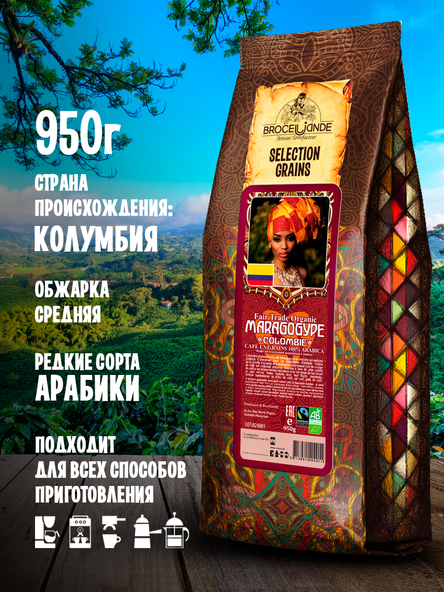 Кофе в зернах "Maragogype Colombia" от Broceliande, 950 грамм в упаковке по 6 штук