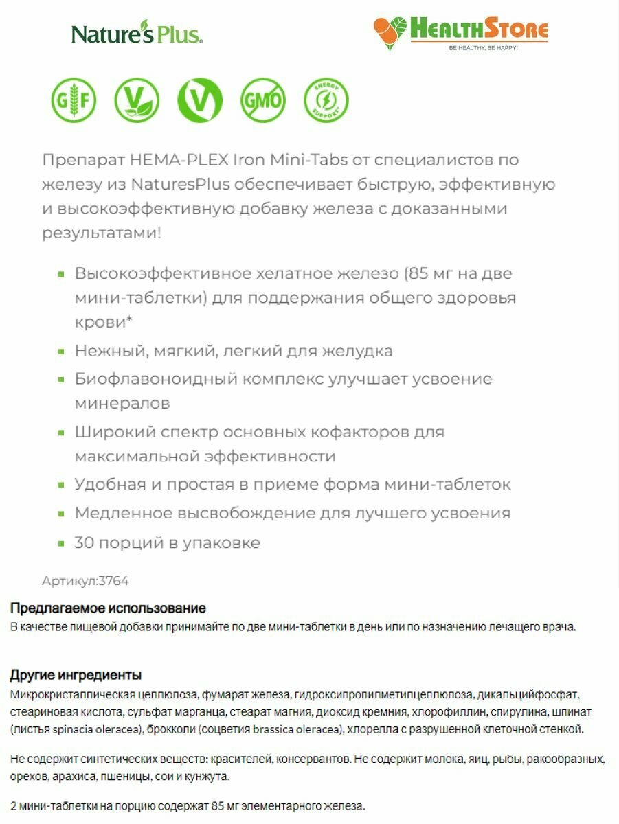 NaturesPlus Hema-Plex Iron 60 slow-release tablets интересное: