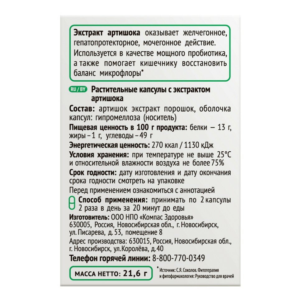 | Состав | артишок экстракт порошок, оболочка капсул: гипромеллоза (носитель) |