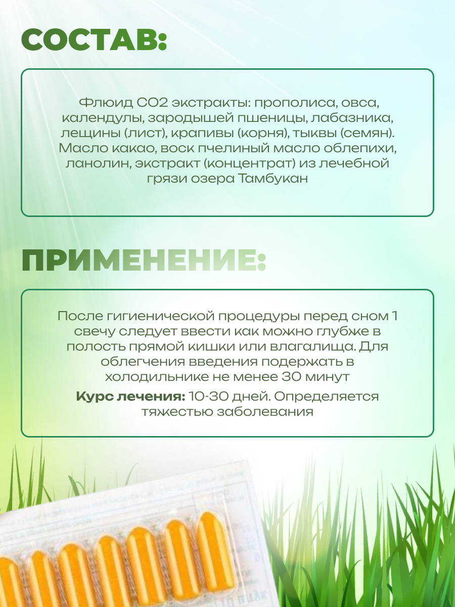 | Способ применения и дозы | После гигиенической процедуры 1 дозу средства ввести в область прямой кишки, вульвы или нанести на окружающие участки кожи. В упаковке 10 суппозиториев, рассчитанных на 1 курс приема. |