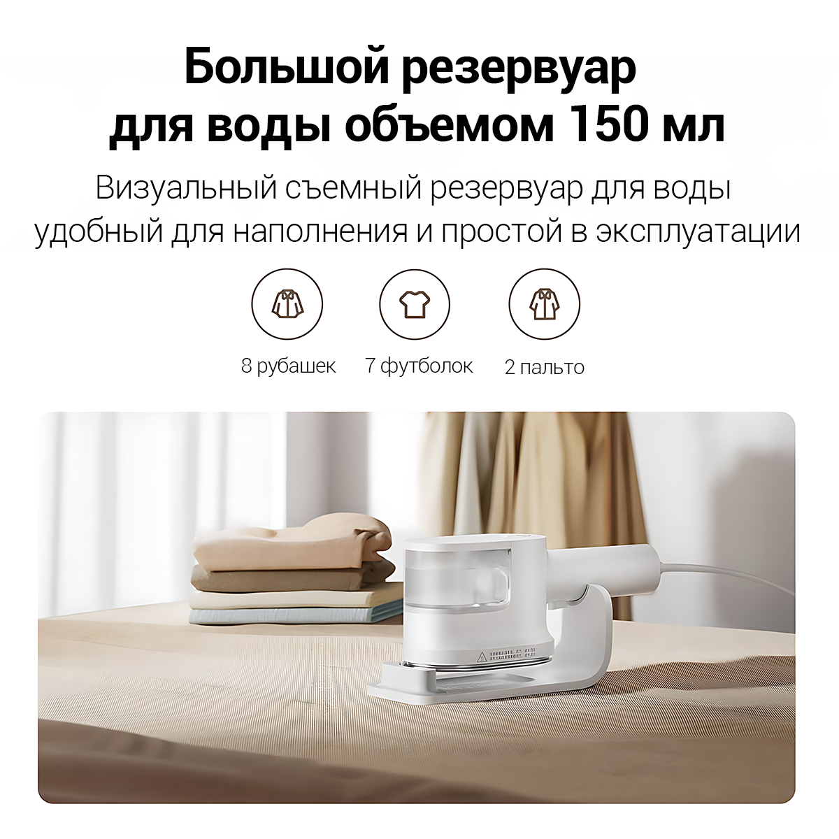| Дополнительная информация | Резервуар 150 мл, функция удаления складок, сухой и влажной глажкой, а также режимами удаления стойких складок и стерилизации и удаления клещей |