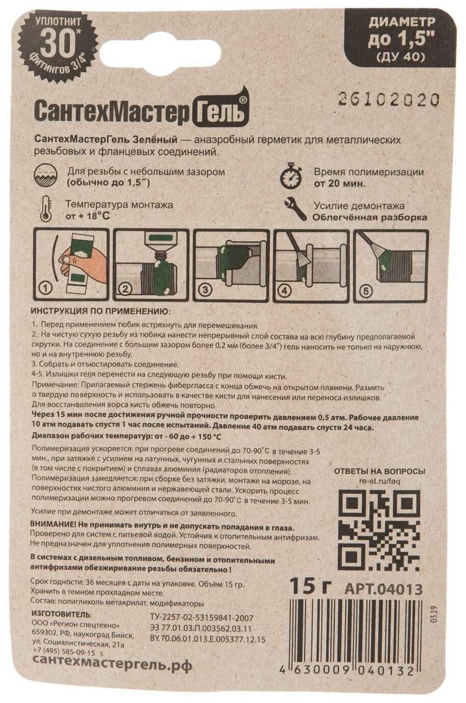 Купить Гель анаэробный для резьбовых и фланцевых соединений тюбик 15гр зеленый СантехмастерГель 04013