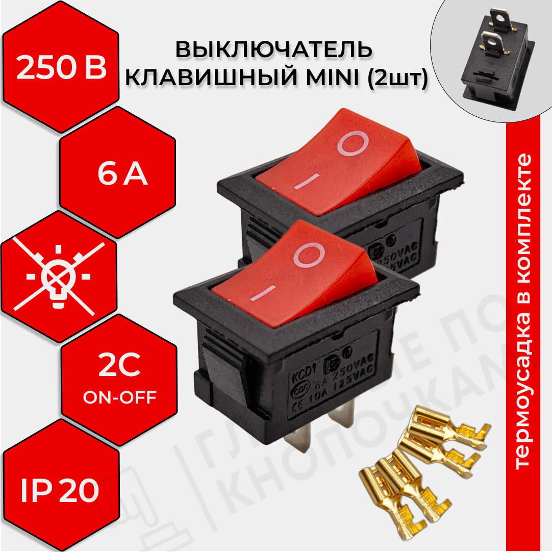 Выключатель клавишный (2 шт) красный Mini KCD1 250V 6А (2с) ON-OFF REXANT (комплект с клеммами и термоусадкой)