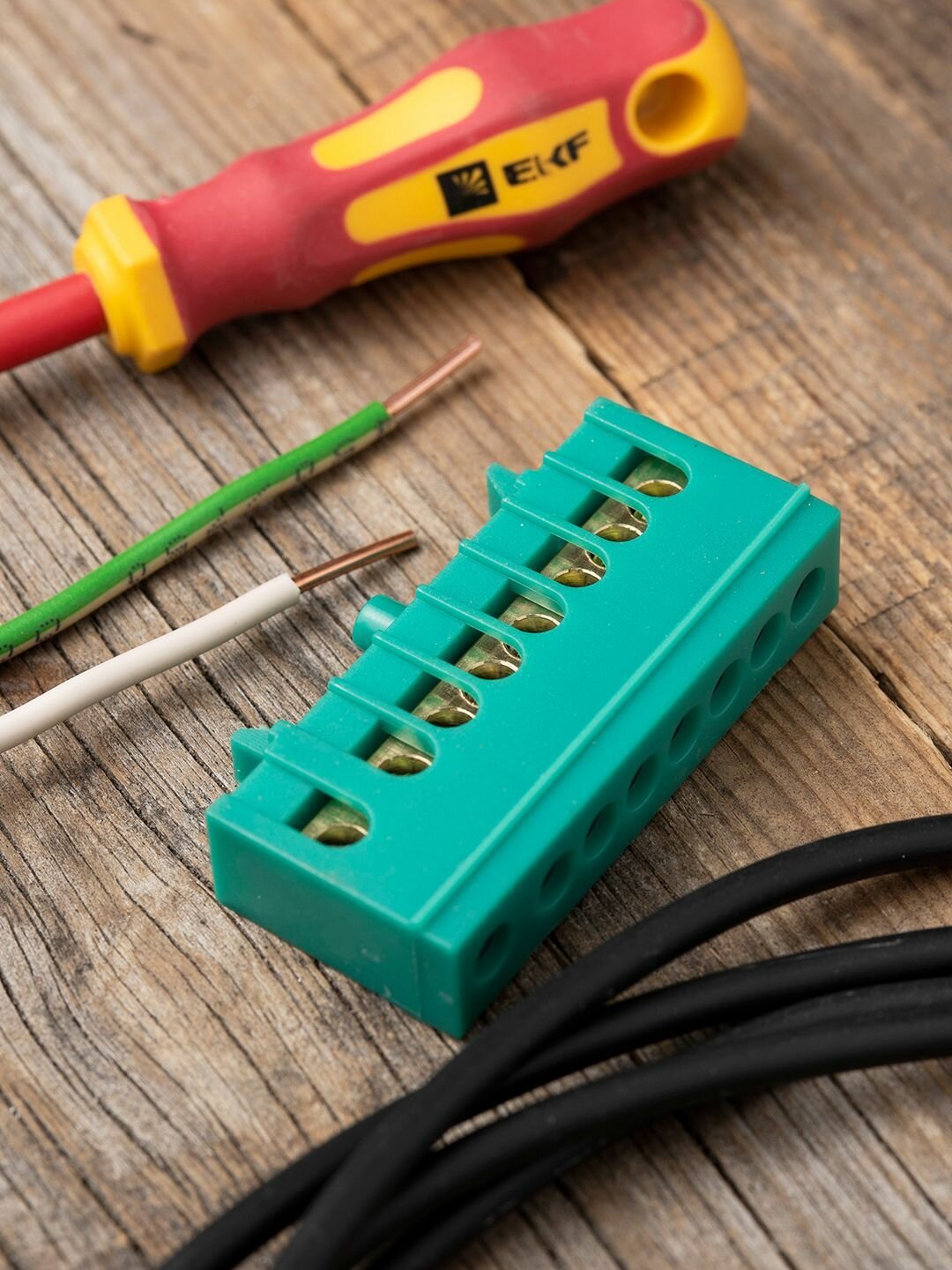 Шина "0" PE (6х9мм) 8 отверстий латунь зеленый изолированный корпус на DIN-рейку розничный стикер EKF PROxima - 1 шт интересное: