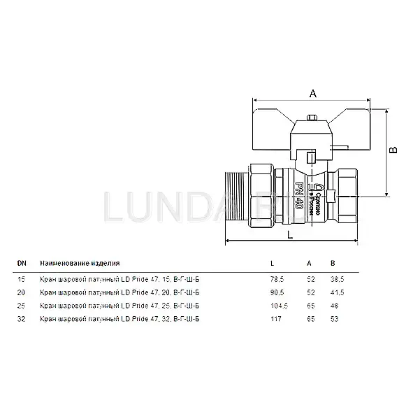 Кран шаровой LD Pride 47.25. В-ГШ. Б, вн. резьба/"американка", ручка-бабочка, 1"