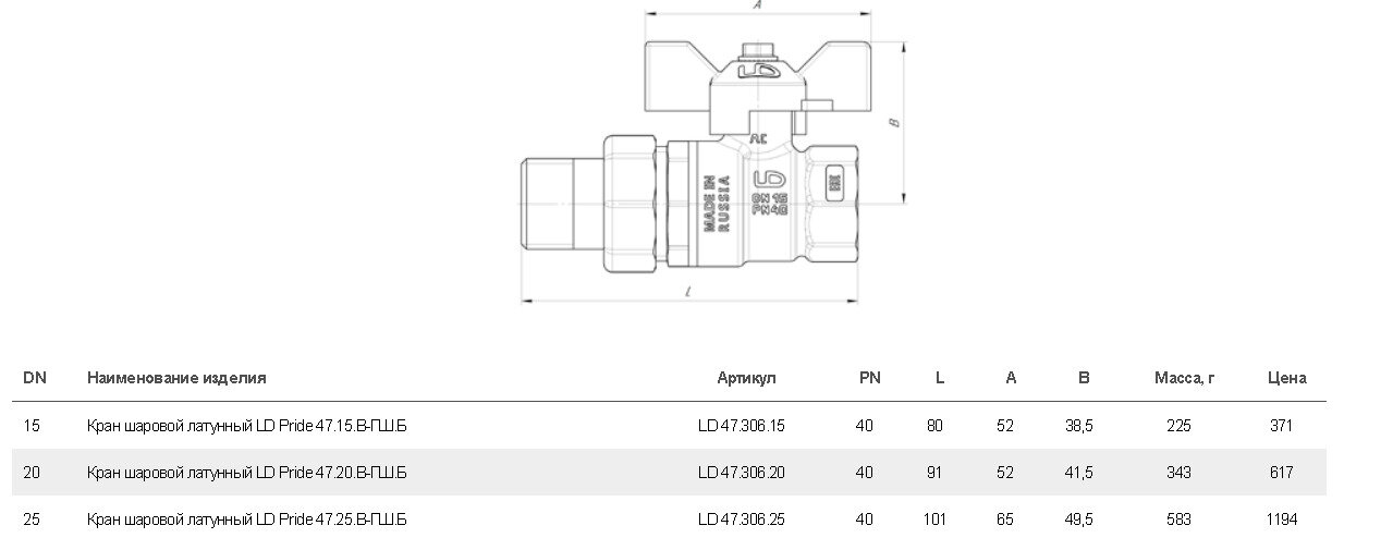 LD Pride Кран шаровой латунный 47.20.В-ГШ.Б, вн.резьба/"американка", ручка-бабочка, 3/4" LD 47.306.20