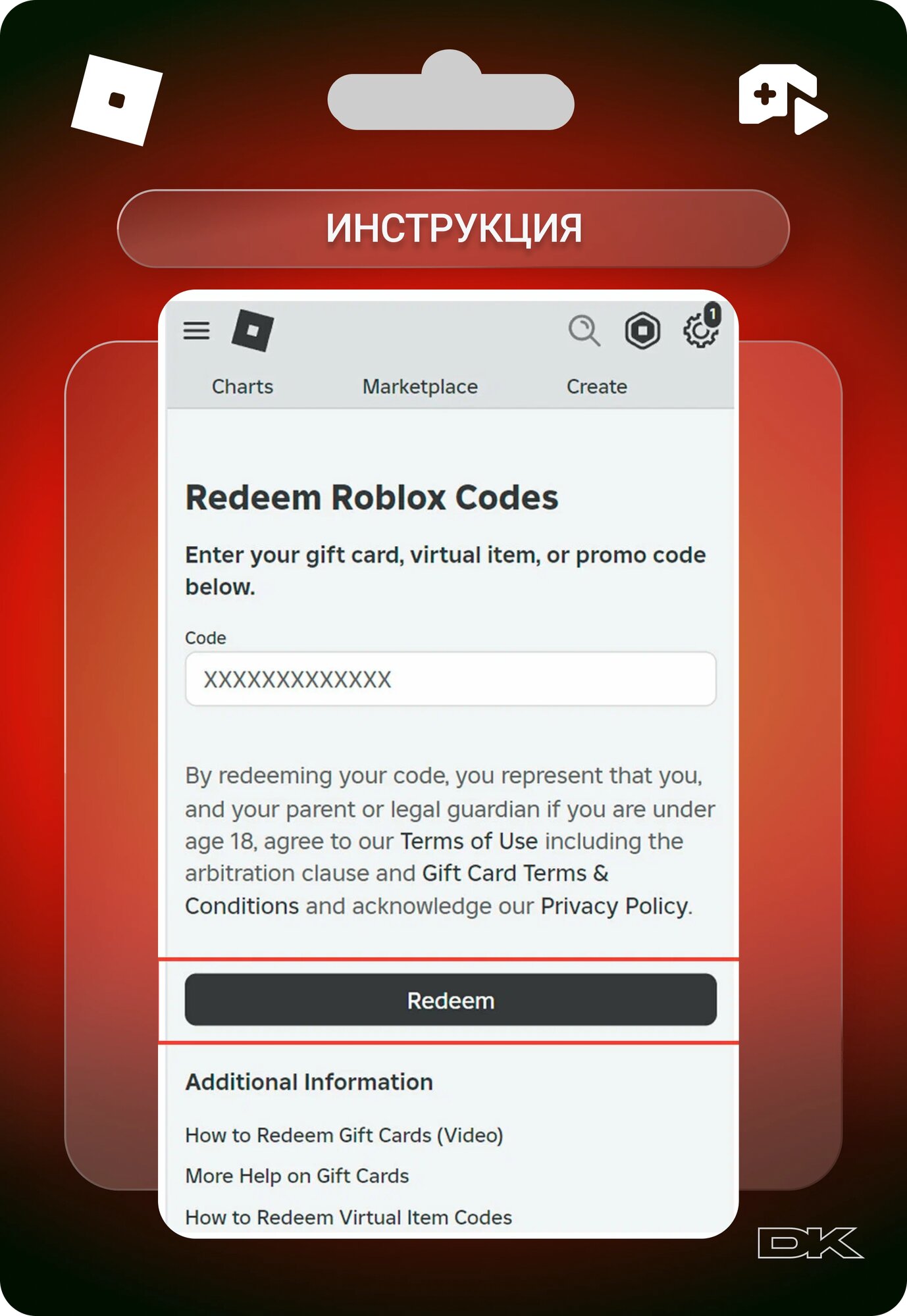 Пополнение счета Roblox на 100 Robux / Код активации Робуксы / Подарочная карта Роблокс / Gift Card (Россия)