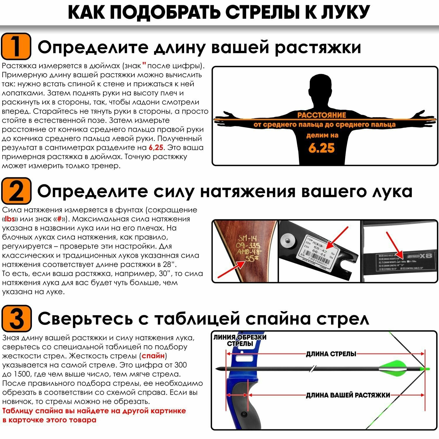 | Подробная комплектация | Стрелы оклеены натуральным оперением и комплектуются наконечником и хвостовиком |