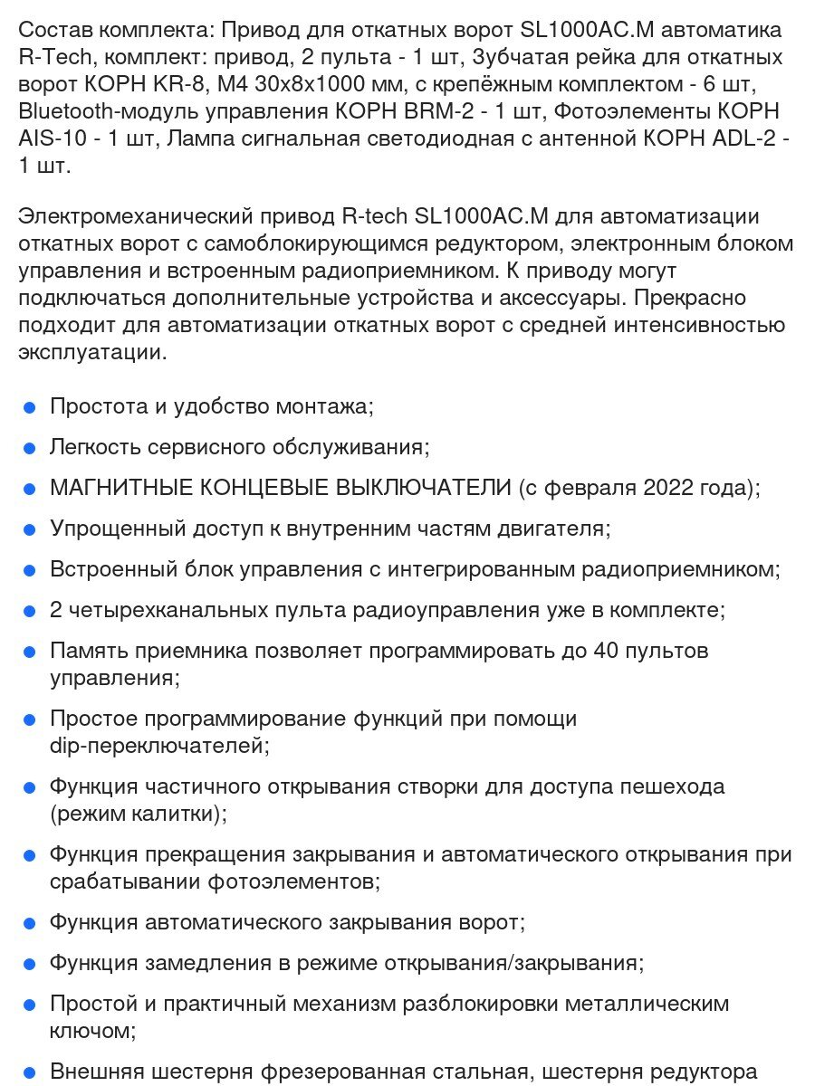 Автоматика для откатных ворот SL1000AC.M FULL-K6-BT, комплект: привод, 2 пульта, Bluetooth-модуль, фотоэлементы, лампа, 6 реек интересное: