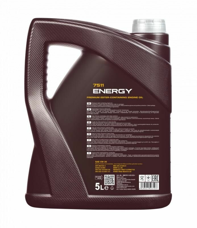 Масло Mannol Energy 5W30 Синт. 7511 (5 Л) Api Sn, Acea A3/B4, Ford Wss-M2c913-B; Vw 502.00/505.00; Mb 229.3 MANNOL арт. 75115