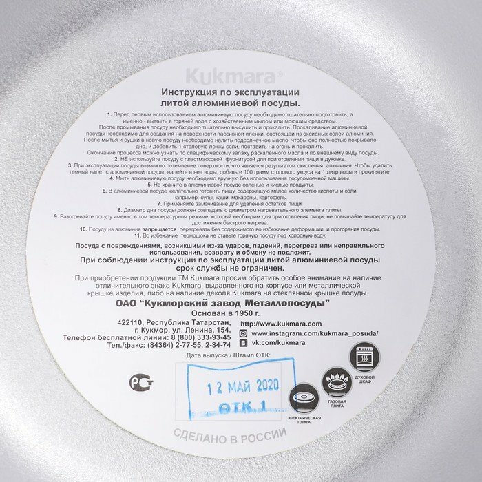 | Плюсы: | Высококачественное изделие от знаменитого российского бренда. ОАО «Кукморский завод Металлопосуды» – один из ведущих российских производителей литой алюминиевой посуды, антипригарной посуды, товаров для туризма и отдыха, известный на рынке 70 лет под ТМ Kukmara. |