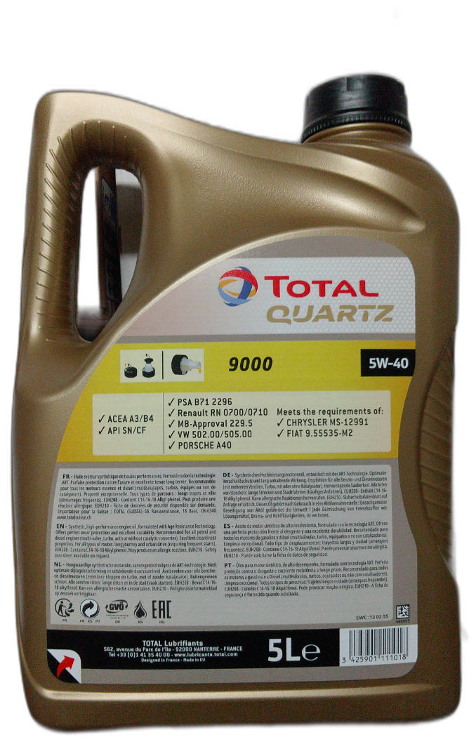 Ниже Вы можете прочитать отзывы на Масло моторное синтетическое Total QUARTZ 9000 5W-40, 5л, арт. 213678, ознакомится с подробными характеристиками, посмотреть интересные обзоры и фотографии на Масло моторное синтетическое Total QUARTZ 9000 5W-40, 5л, арт. 213678.