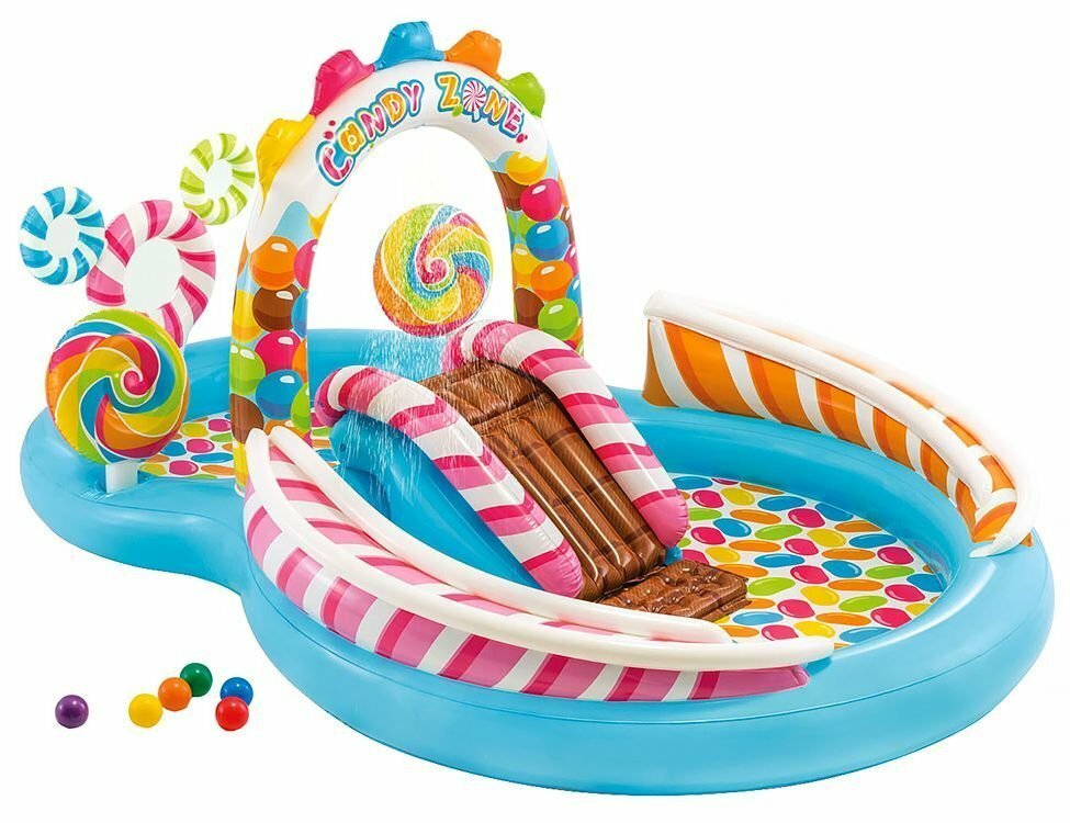 Надувной игровой центр Intex 57149 Территория сладостей с горкой распылителем 2 круга и 6 шаров 295x191x130 см