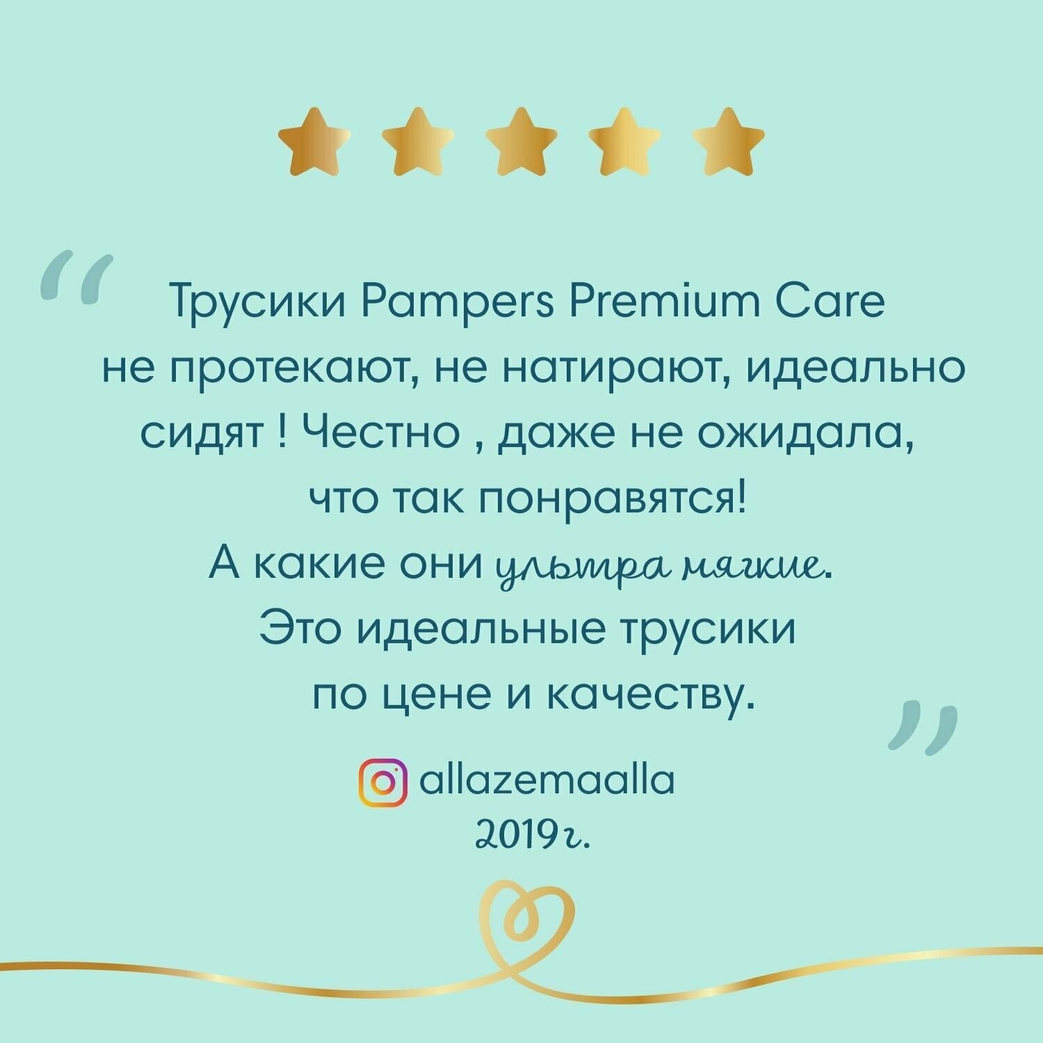 | Отзыв: | Для нас самые идеальные трусики-подгузники, мягкие, хорошо впитывают и не протекают, резиночки мягкие, нигде не натирают и не давят на животик |